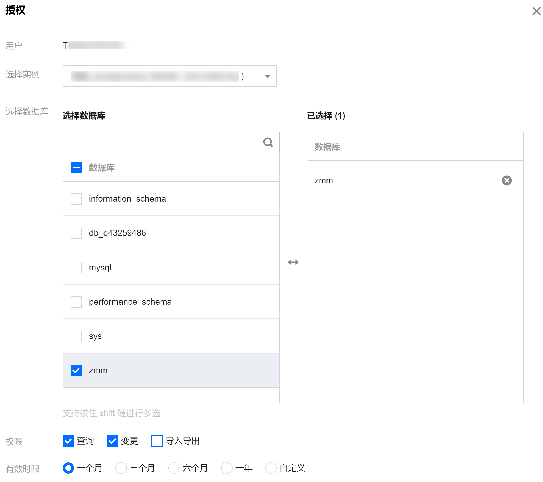 在弹出的对话框中选择数据库实例、数据库、权限和权限有效期,配置完成后单击