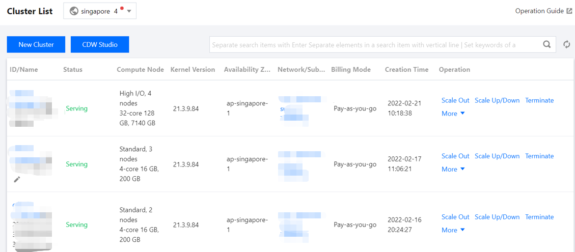 地域 | 目前云数据仓库 TCHouse-C 支持北京、上海、广州、成都、南京、香港以及新加坡、雅加达、东京、法兰克福地域,建议按业务就近的原则选择合适的地域,地域一旦选定,购买后无法更改。 |
