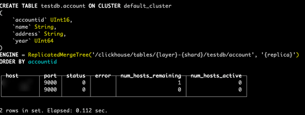 CREATE TABLE testdb.account ON CLUSTER default_cluster(accountid UInt16,name String,address String,year UInt64) ENGINE =ReplicatedMergeTree('/clickhouse/tables/{layer}-{shard}/testdb/account', '{replica}') ORDER BY (accountid);