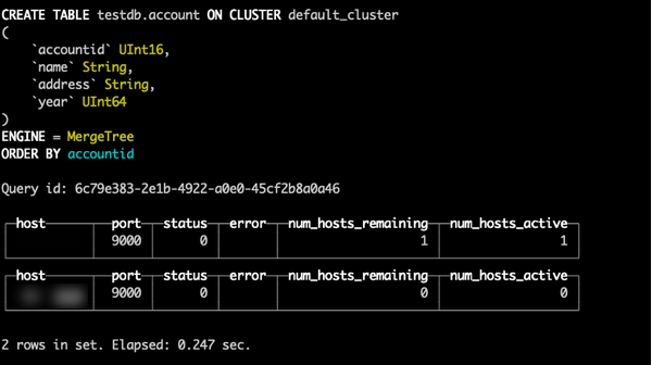 CREATE TABLE testdb.account ON CLUSTER default_cluster(accountid UInt16, name String, address String, year UInt64) ENGINE =MergeTree() ORDER BY (accountid);