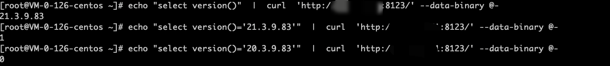 echo "select version()=21.3.9.83" | curl 'http://xxx.xxx.xxx.xxx:8123/' --data-binary @-