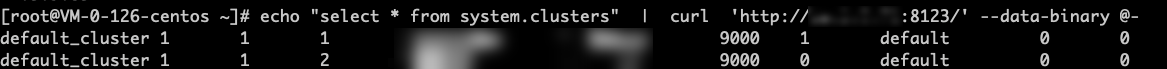 echo "select * from system.clusters" | curl 'http://xxx.xxx.xxx.xxx:8123/' --data-binary @-