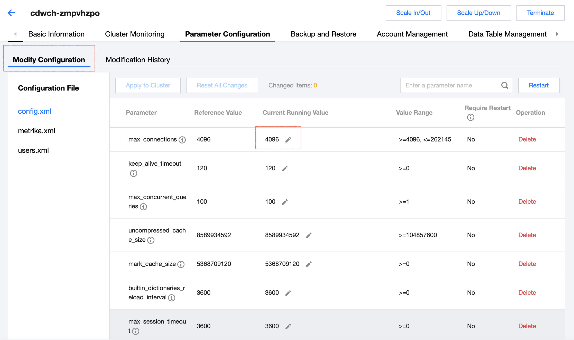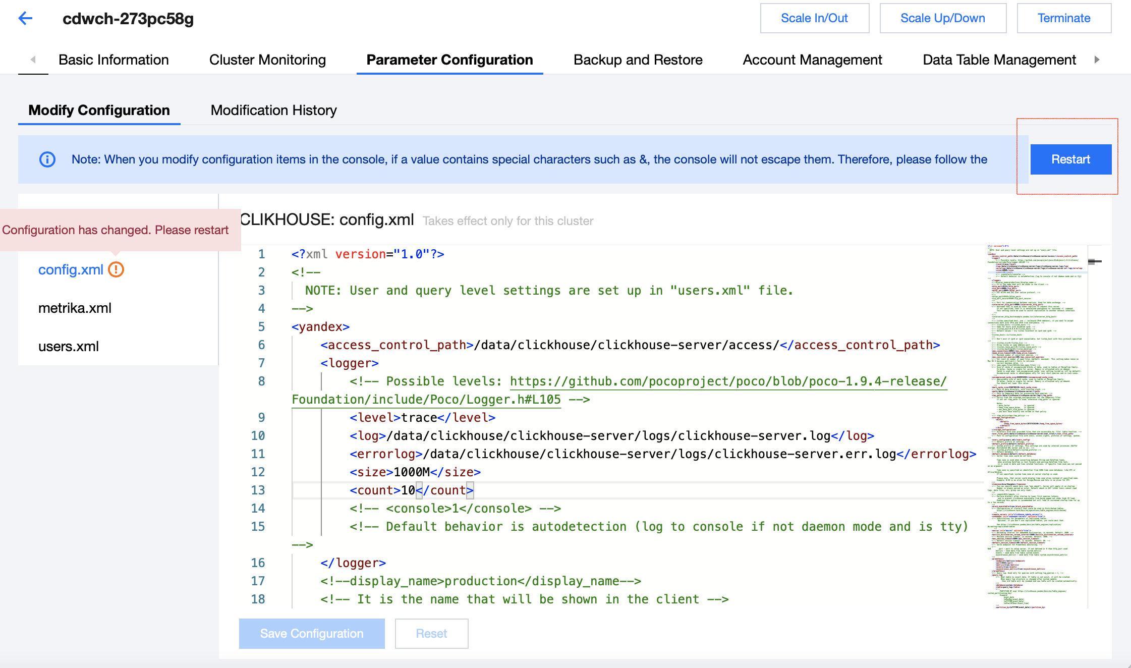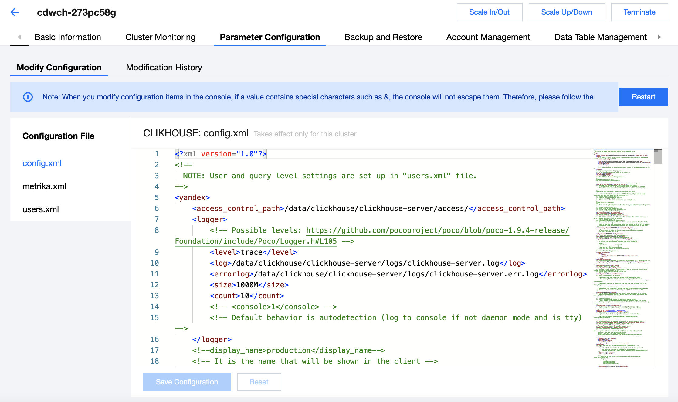 <yandex><logger><level>trace</level><log>/data/clickhouse/clickhouse-server/logs/clickhouse-server.log</log><errorlog>/data/clickhouse/clickhouse-server/logs/clickhouse-server.err.log</errorlog><size>1000M</size><count>10</count></logger><http_port>8123</http_port><tcp_port>9000</tcp_port><mysql_port>9004</mysql_port><interserver_http_port>9009</interserver_http_port><path>/data/clickhouse/clickhouse-server/</path><tmp_path>/data/clickhouse/clickhouse-server/tmp/</tmp_path><user_files_path>/data/clickhouse/clickhouse-server/user_files/</user_files_path><users_config>users.xml</users_config><timezone>Asia/Shanghai</timezone><mlock_executable>true</mlock_executable><remote_servers incl="clickhouse_remote_servers" /><zookeeper incl="zookeeper-servers" optional="true" /><macros incl="macros" optional="true" /><prometheus><endpoint>/metrics</endpoint><port>9363</port><metrics>true</metrics><events>true</events><asynchronous_metrics>true</asynchronous_metrics></prometheus><query_log><database>system</database><table>query_log</table><partition_by>toYYYYMM(event_date)</partition_by><flush_interval_milliseconds>7500</flush_interval_milliseconds></query_log><trace_log><database>system</database><table>trace_log</table><partition_by>toYYYYMM(event_date)</partition_by><flush_interval_milliseconds>7500</flush_interval_milliseconds></trace_log><query_thread_log><database>system</database><table>query_thread_log</table><partition_by>toYYYYMM(event_date)</partition_by><flush_interval_milliseconds>7500</flush_interval_milliseconds></query_thread_log><compression incl="clickhouse_compression"></compression><distributed_ddl><path>/clickhouse/task_queue/ddl</path></distributed_ddl><listen_host>0.0.0.0</listen_host><zookeeper incl="zookeeper-servers" optional="true" /><macros incl="macros" optional="true" /><include_from>/etc/clickhouse-server/metrika.xml</include_from></yandex>