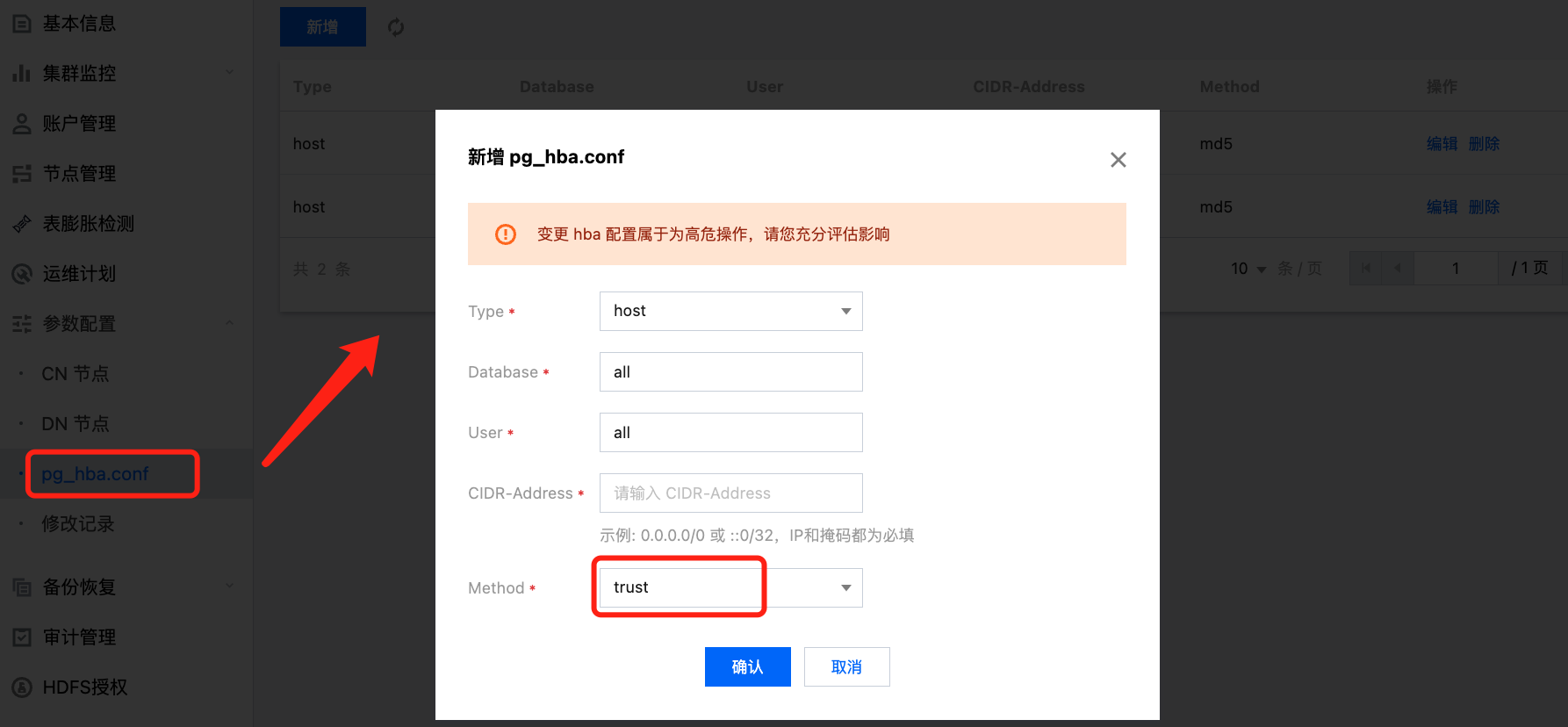 3. 单击新建,Method选择trust,根据需要输入数据库名、用户名和 CIDR 地址。