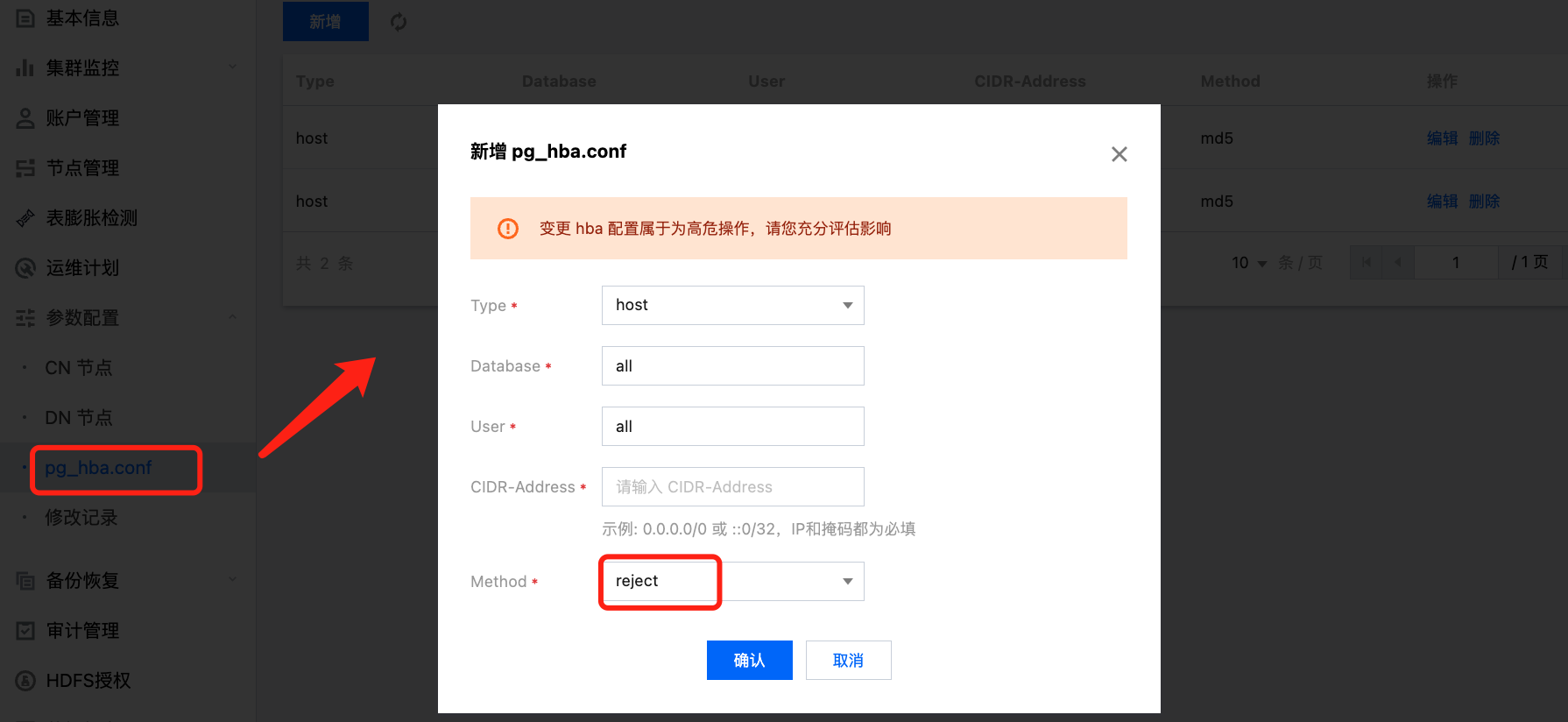 3. 单击新建,Method 选择 reject,根据需要输入数据库名、用户名和 CIDR 地址。