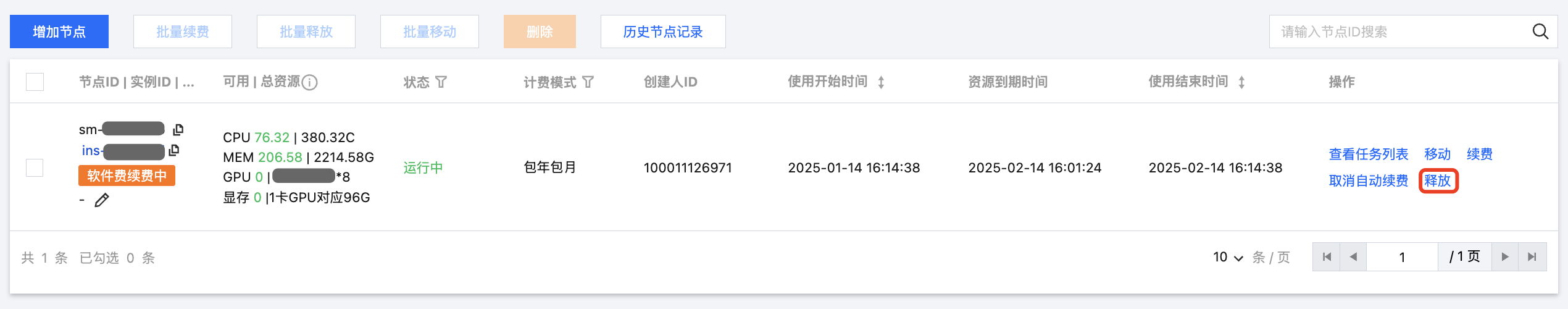 在“资源组管理 > 详情 > 节点列表”中单击释放按钮后,可将 “运行中”或“异常”状态的节点进行释放(释放后的 CVM 机器将不再被 TIONE 平台使用),同时停止计费并退还剩余软件订阅费用。