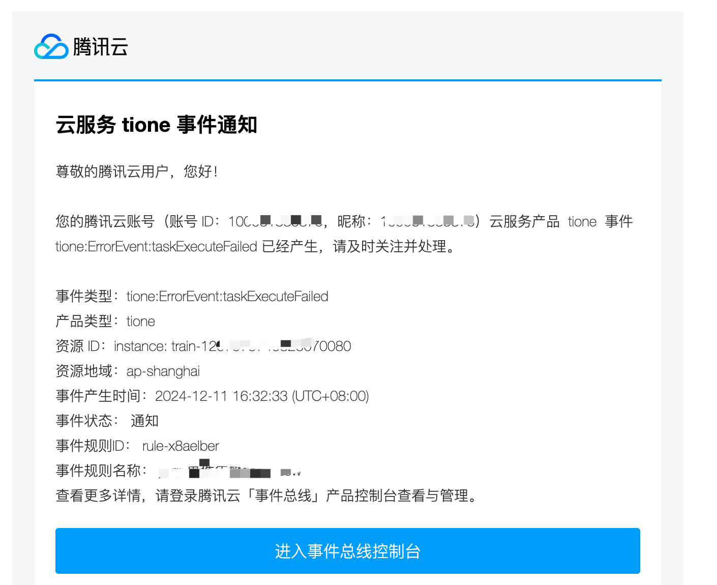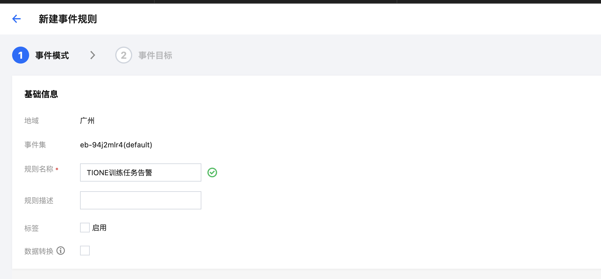训练任务过程中产生的重要事件信息已经接入了腾讯云可观测平台事件总线,用户可以在事件总线配置事件规则进行相关事件的告警推送。目前已经支持的事件为任务进入排队(taskScheduling)、任务进入运行(taskRunning)、排队运行完成(taskCompleted)、任务执行失败(taskExecuteFailed)、任务自动重启(taskRestarted)、任务被抢占(taskPreempted)、任务已停止(taskStopped)。 操作步骤