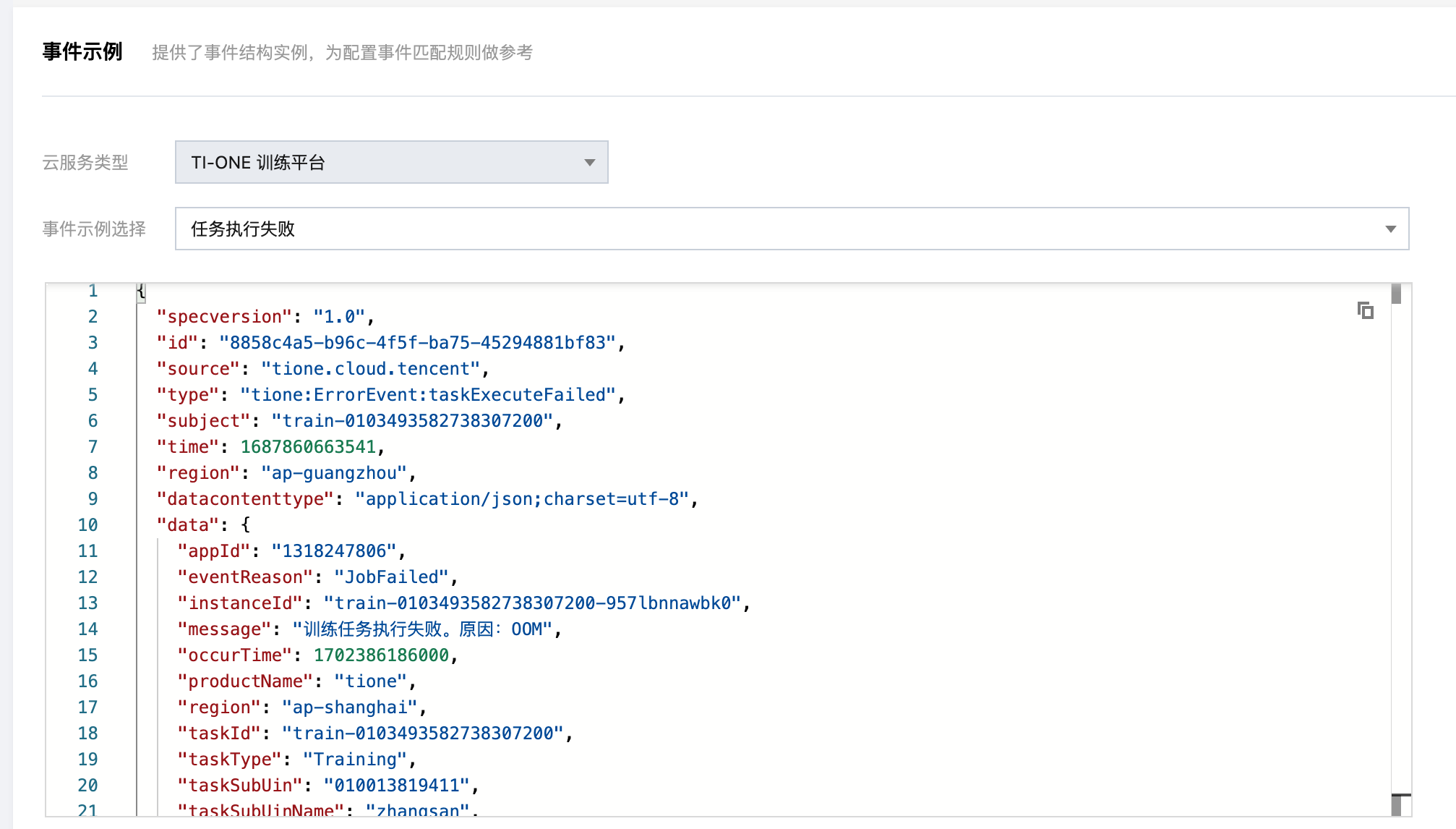 下拉可以选择查看事件示例,表示云服务产品投递到事件总线的事件结构。后续的事件匹配规则可以按照上述事件结构自定义编写。