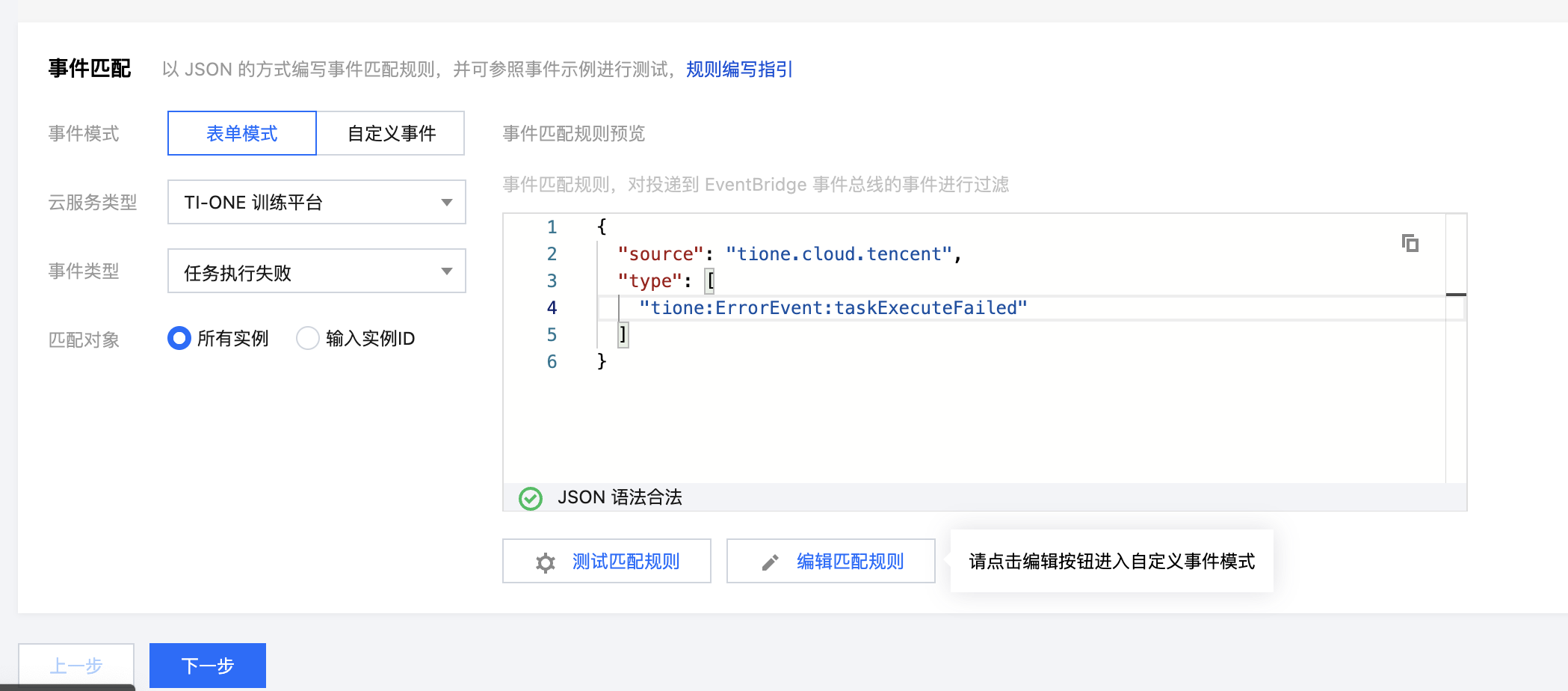 事件匹配规则可以根据表单模式或者自定义事件模式,推荐使用自定义事件模式。TIONE 平台当前支持针对部分实例(例如部分训练任务)和全部实例(全部训练任务,新增的训练任务自动加入规则告警队列),同时平台还支持按照云产品标签或者任务创建者进行事件规则匹配,以下是部分示例: