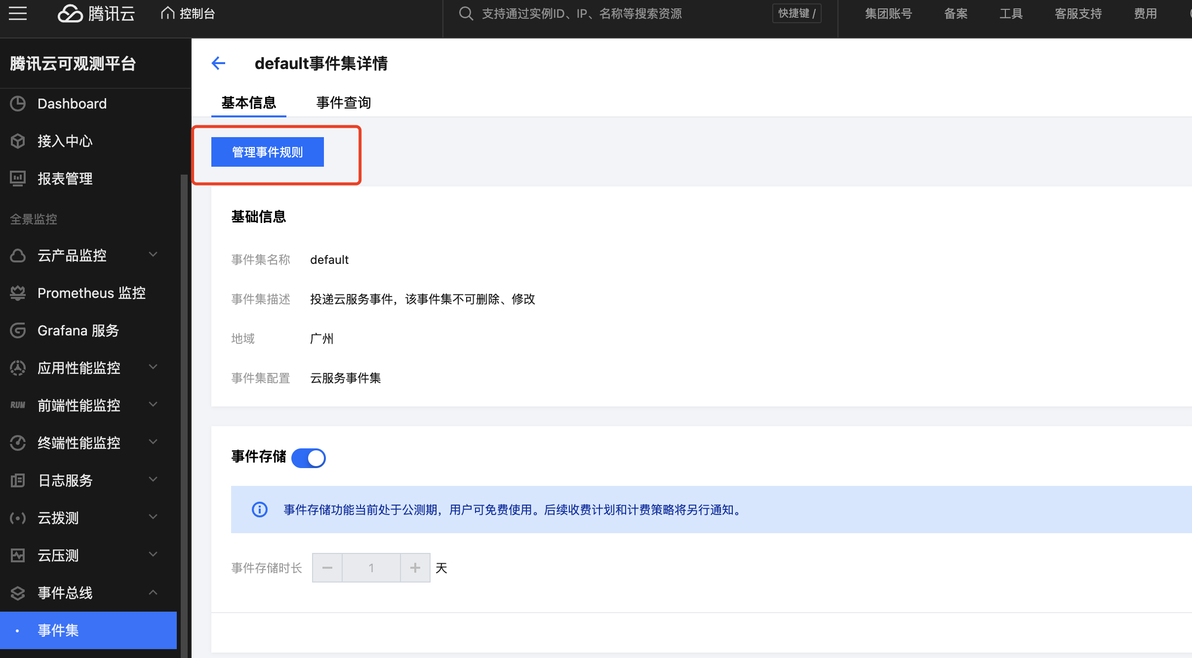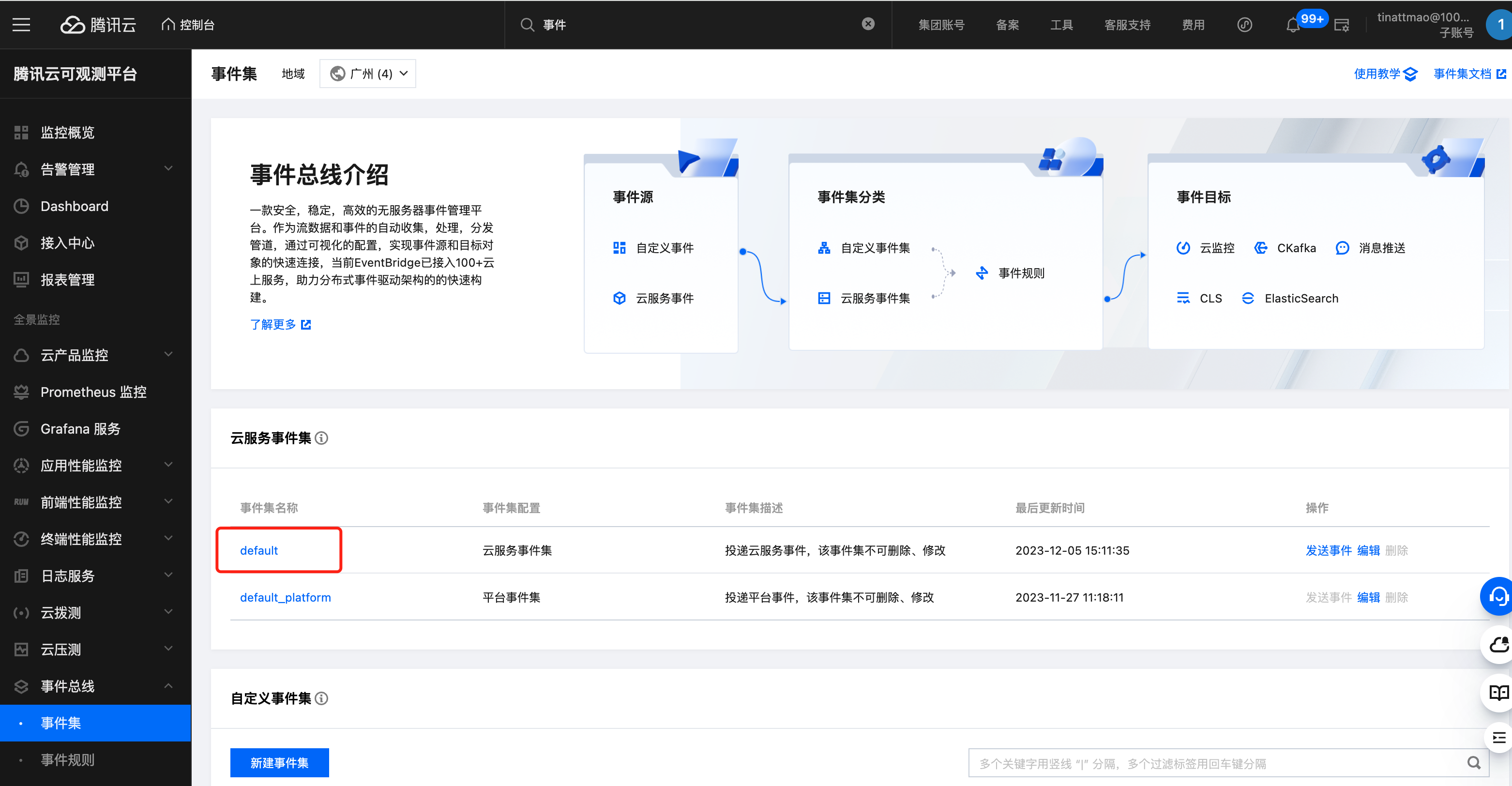 1. 进入可观测平台 > 事件集,进入云服务事件集-default事件集(该事件集用于接收云服务告警、审计等类型事件,无地域概念,全地域云服务事件默认全部投递至广州,如希望配置告警,您需要在该事件集下绑定告警规则)。 2. 单击管理事件规则,可进入事件规则列表,您可在这里配置事件的匹配规则,事件目标等。