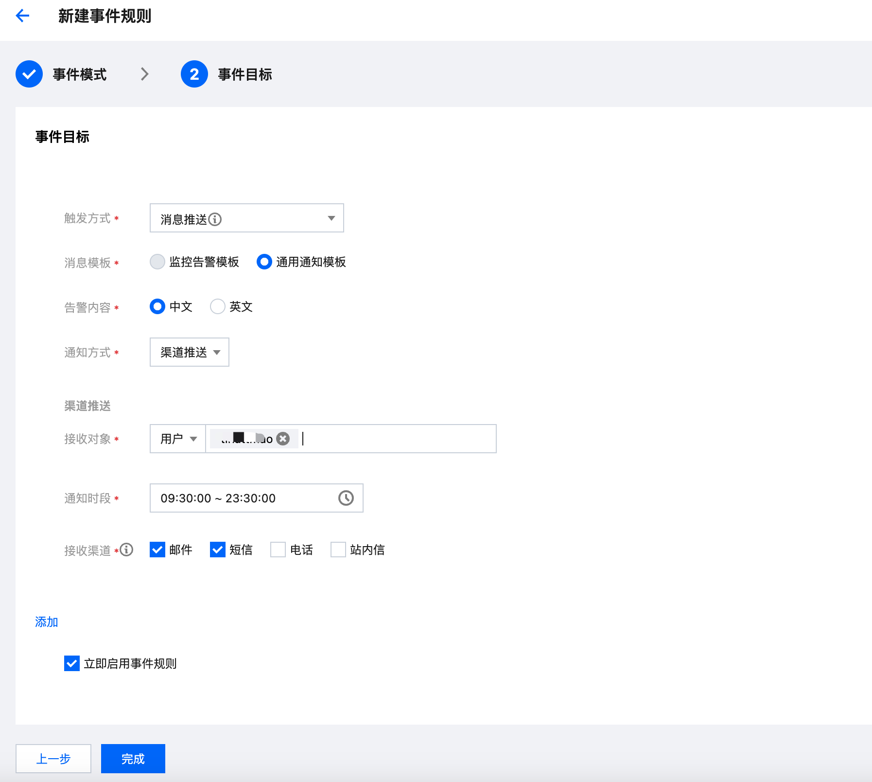 4. 完成事件匹配后,单击下一步,开始配置事件目标(也就是告警渠道),选择触发方式为 消息推送,通知方式为 渠道推送,选择接收对象(可以选择一个或者多个告警接收账号),选择接收渠道(支持邮件,短信,电话,站内信),单击完成后即可返回事件规则页面。