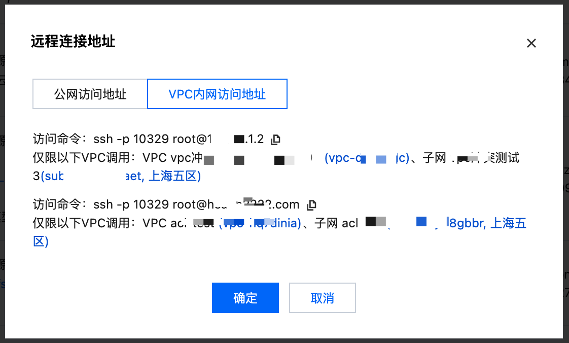 2. 配置完成后,在开发机实例列表页,单击远程连接,则可查看当前实例的 VPC 内访问地址和所生效的 VPC 和子网信息,如下图所示。您可以在本地客户端直接复制该地址连接该实例。