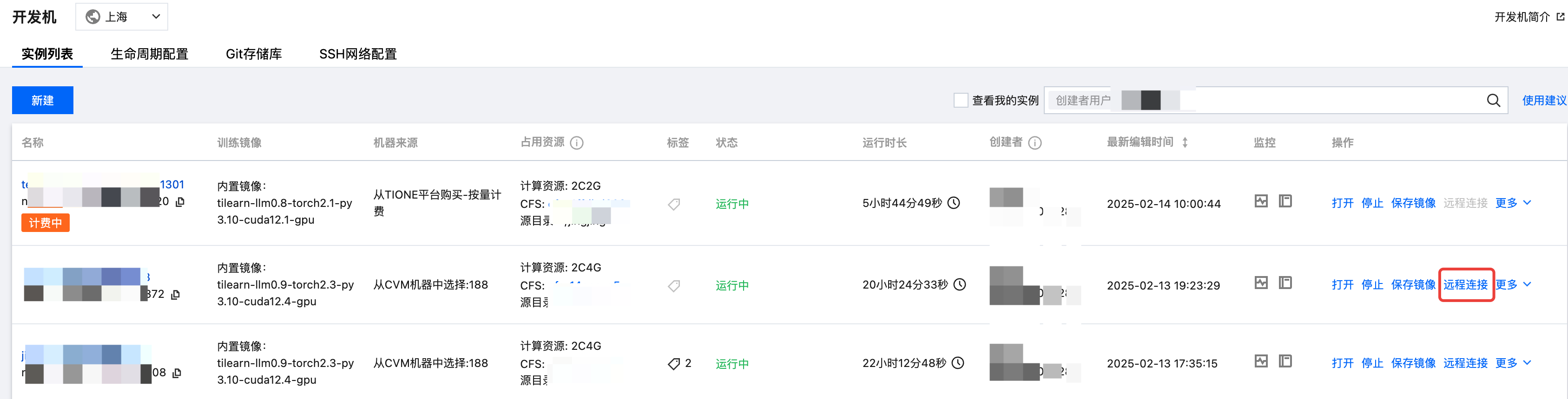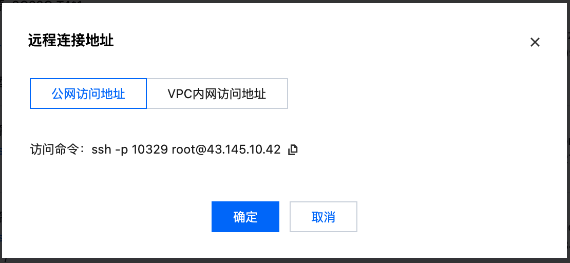 开发机实例支持通过 SSH 远程连接,远程连接可提供公网访问地址和 VPC 内访问地址,其中公网访问地址无需配置,平台会默认生成,如下图所示: