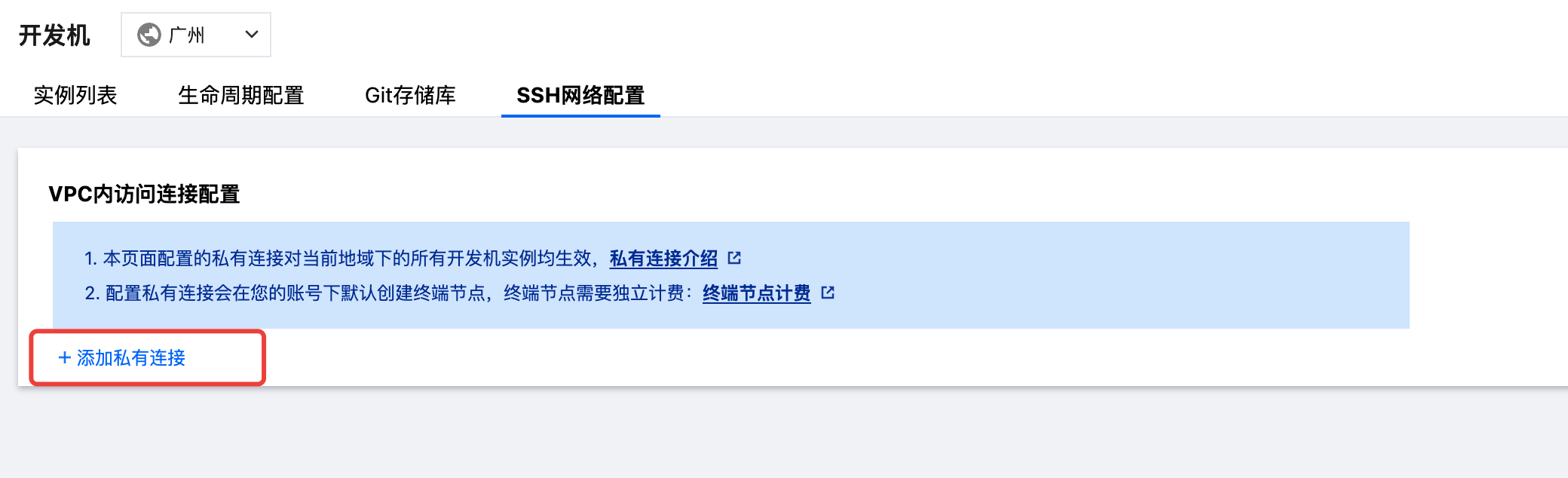 私有连接配置一旦完成,则对当前地域下的所有开发机实例均生效。