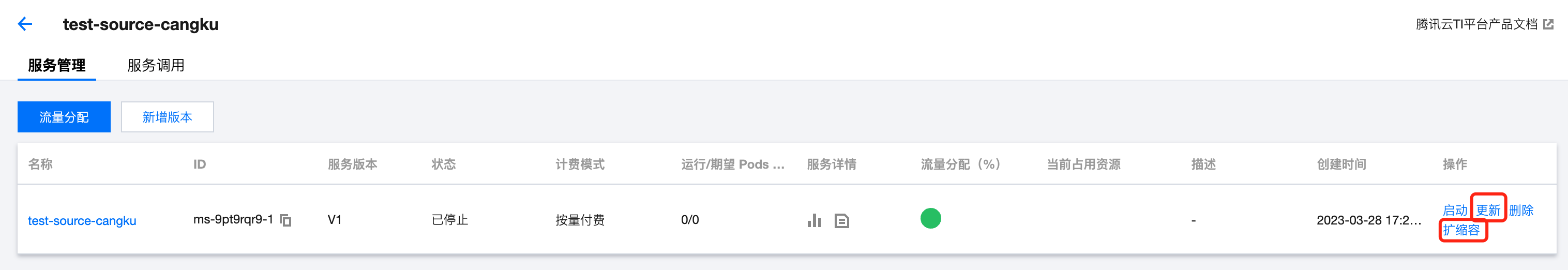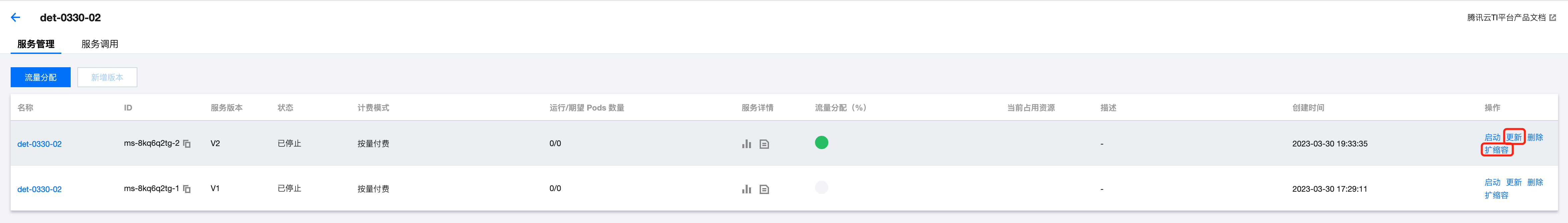 1. 在线服务列表页面,单击服务名称进入版本列表页后,单击服务版本更新操作进入服务更新页面。支持编辑修改实例容器、实例调节模块的相关信息。 2. 若需进行服务扩缩容操作,可直接单击扩缩容进行快捷实例更新操作,当扩容的实例状态为运行中,流量分配至扩容实例。