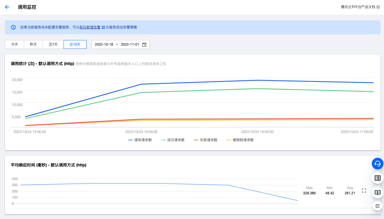 为了满足服务运行情况追踪的诉求,平台提供服务数据监控、调用数据监控、事件与日志查看能力。
