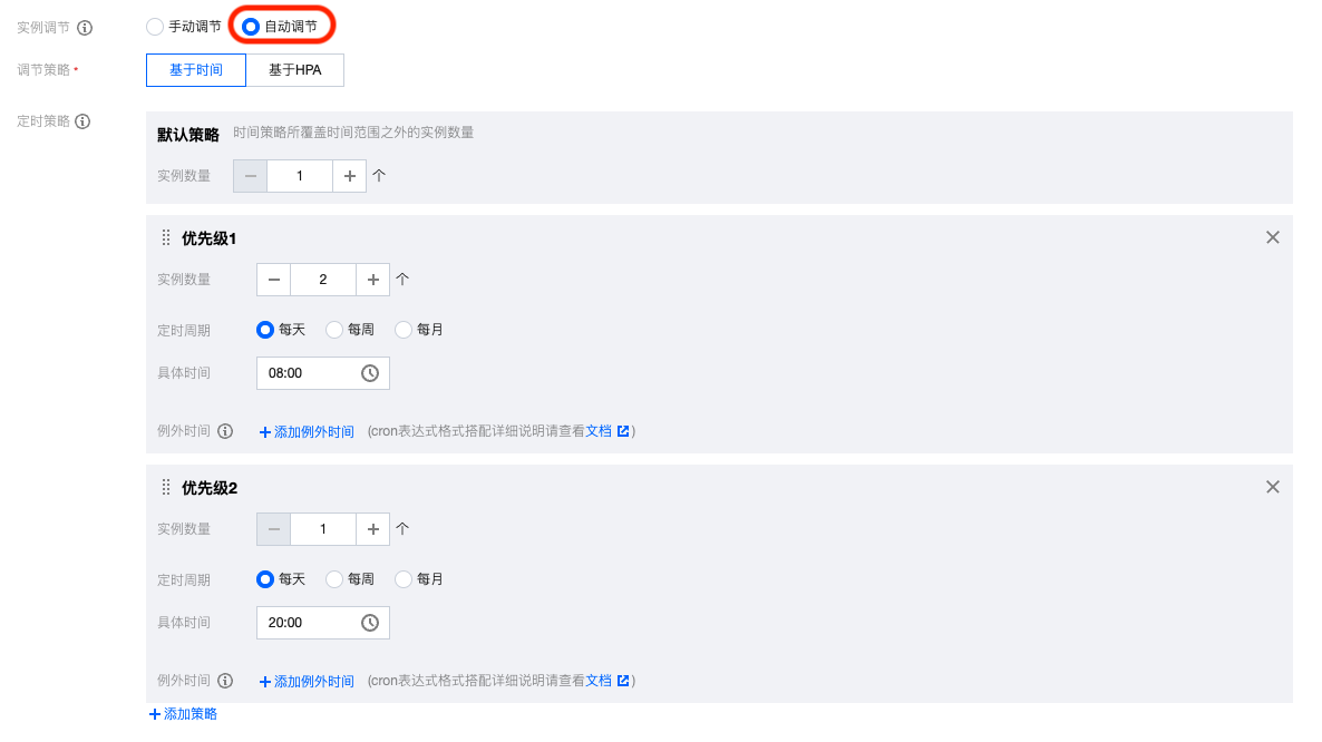 自动扩缩容支持两种类型的调节策略:基于时间调节、基于 HPA 调节,下文将详细介绍两种调节策略的使用方法。