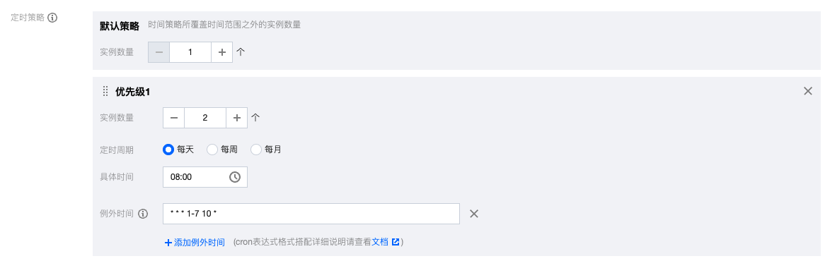 1.4 您可以根据实际业务负载的时间特征自行配置多条定时策略规则,例如若8:00至20:00为业务高峰时段,20:00至8:00为业务低谷时段,则可以配置如下图的定时策略,每日8:00将实例数扩容至2,每日20:00将实例数缩容为1(默认策略为服务启动后的初始实例数量);