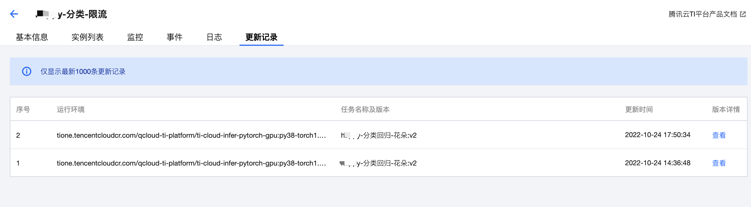 5. 在服务版本列表页单击服务版本名称,进入更新记录模块,可查看当前服务版本历史的更新记录信息。 说明: