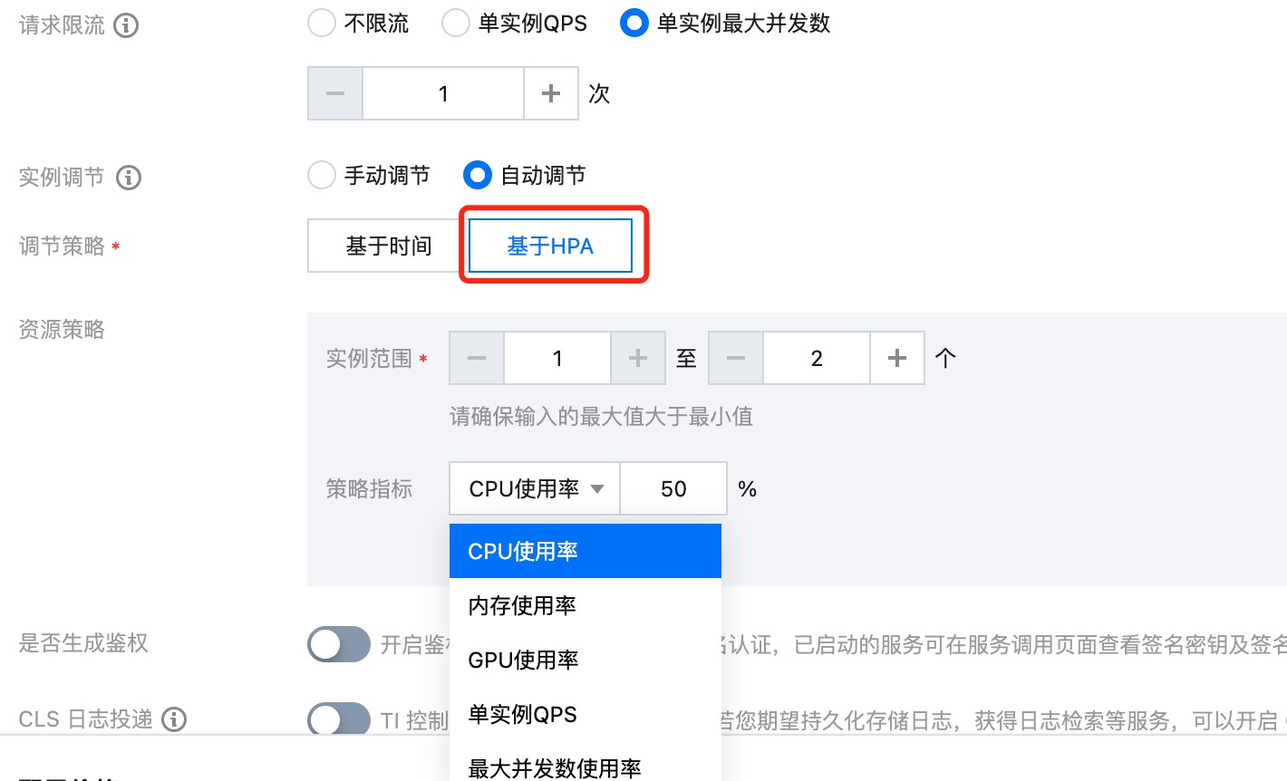 其中策略指标需要配置“最大并发数使用率”时,请先在请求限流处配置“单实例最大并发数”。