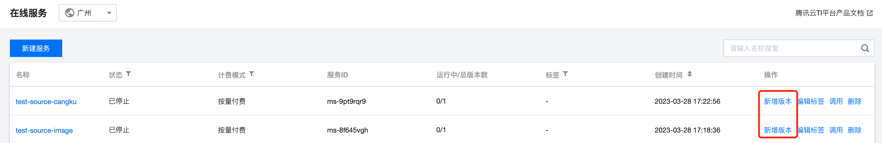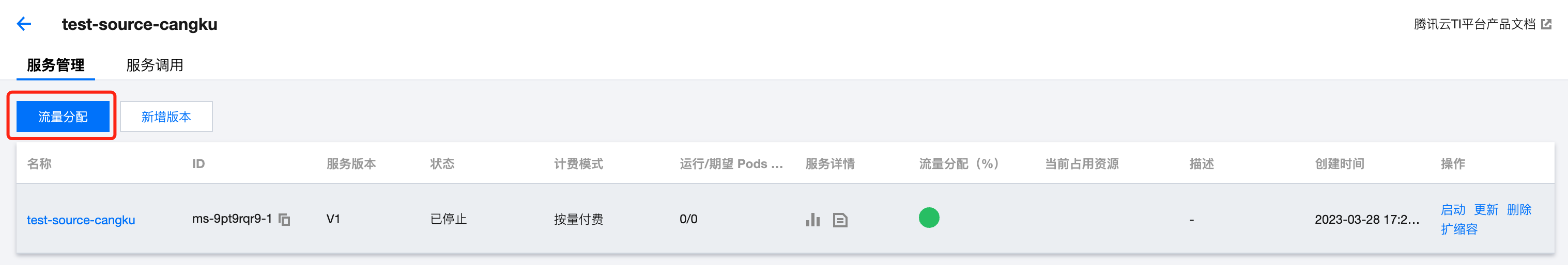 2. 找到需要测试的服务,单击服务的新增版本操作,打开服务版本创建页,按需配置当前服务版本的容器信息及实例调节信息。 3. 单击启动服务,若为后付费模式则需进行费用冻结确认,即可完成新版本创建。