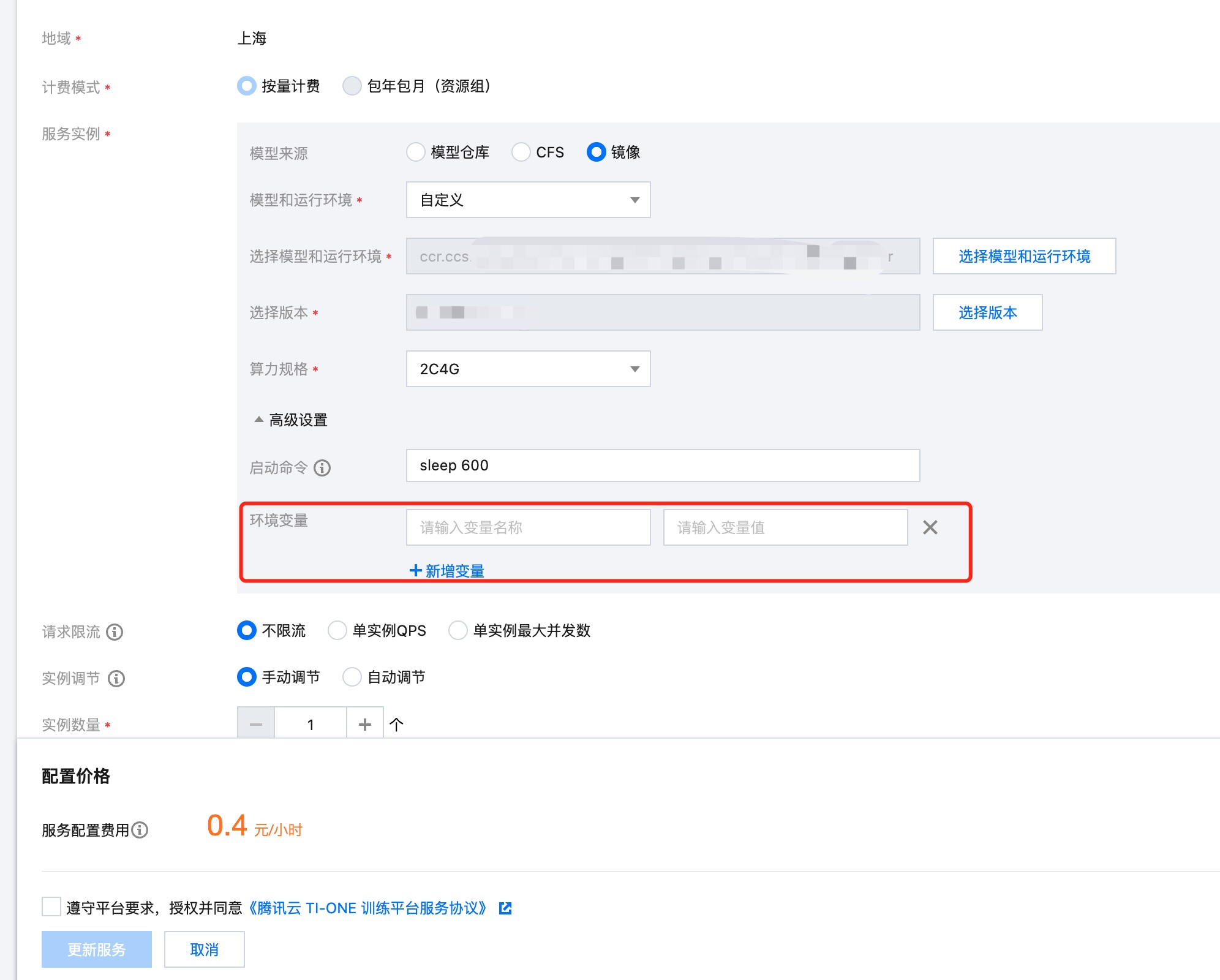 1. 在线服务列表页面,单击服务名称进入版本列表页后,单击服务调用>调用监控,可查看服务调用情况的统计信息,包括接收请求数、成功请求数、失败请求数、被限制请求数、平均响应时间。 2. 在线服务监控页面,可跳转到腾讯云可观测平台的告警管理里,为服务添加告警策略。 3. 在线服务列表页面,单击服务名称进入版本列表页后,单击服务版本名称进入版本详情页面,可查看服务监控(实例数量、运行中实例数量、CPU使用率、MEM使用率、GPU使用率、显存使用率、网络流量、QPS和QPS限流)、事件监控、运行日志。 服务更新