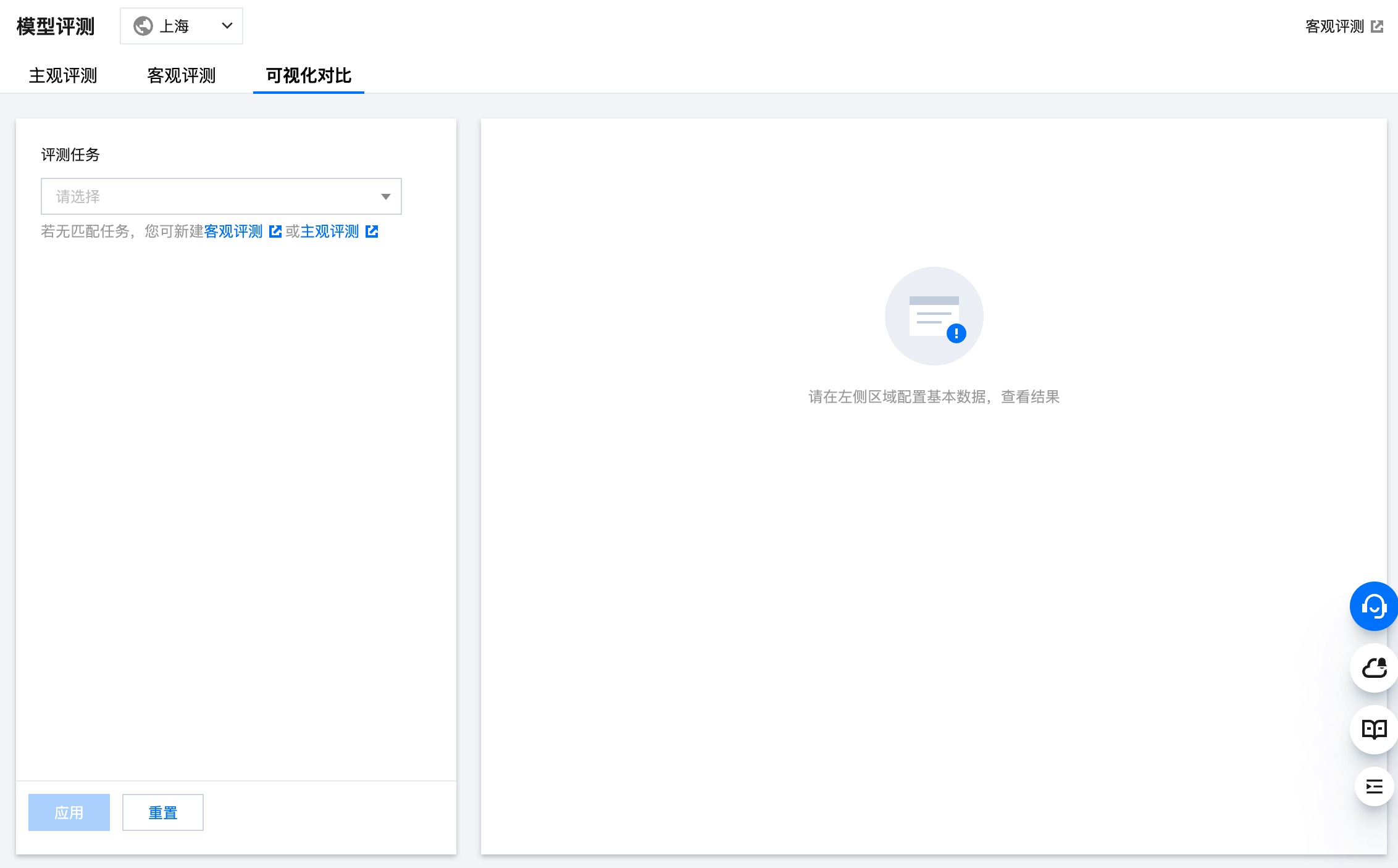 3. 如需重新选择评测任务、对比数据集、对比模型,选择好后,单击应用,右侧图表会根据最新选择更新,否则每次进入该页面均按照上次提交“应用”的配置展示。