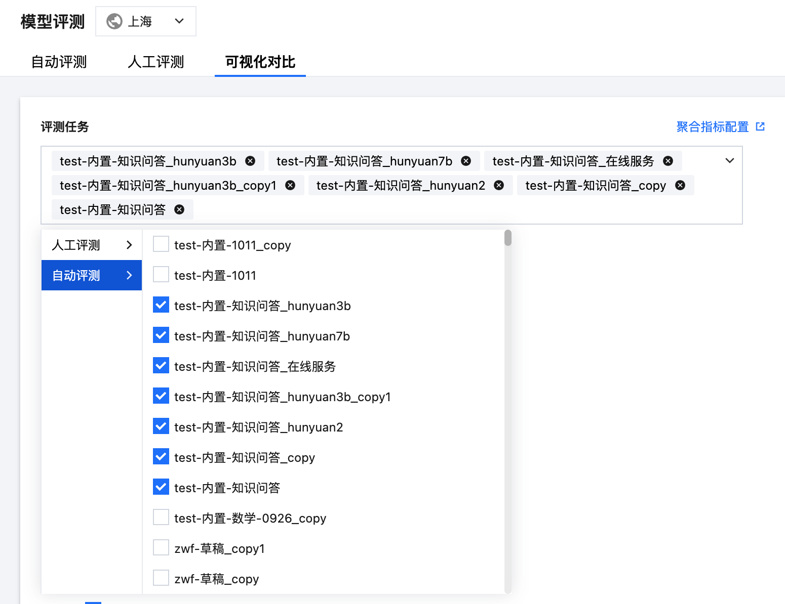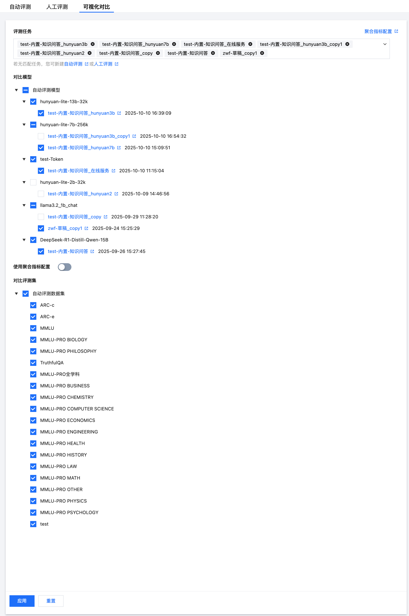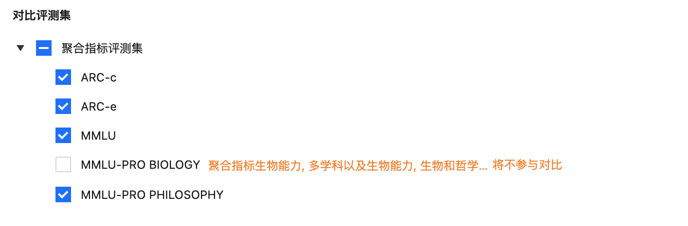 聚合指标配置中的评测集会进行罗列,用户可根据需要选择要对比的评测集,需要注意的是,当用户取消勾选某个评测集后,此评测集相关的聚合指标将不会纳入对比。