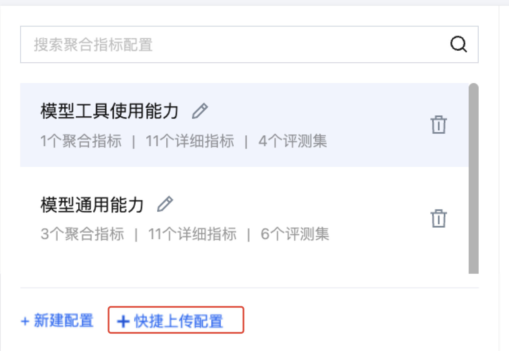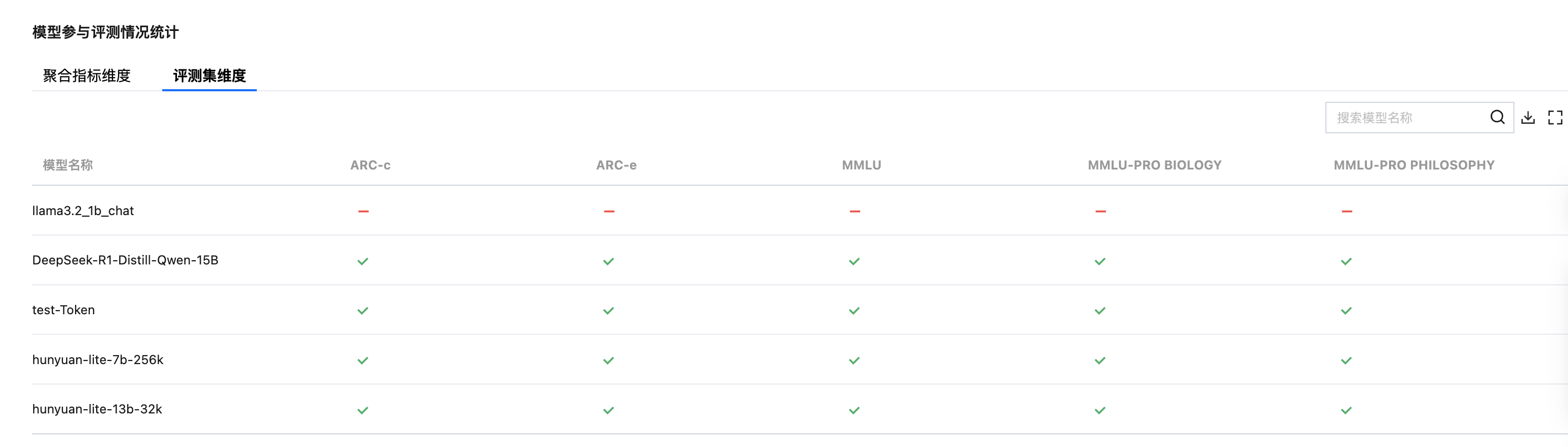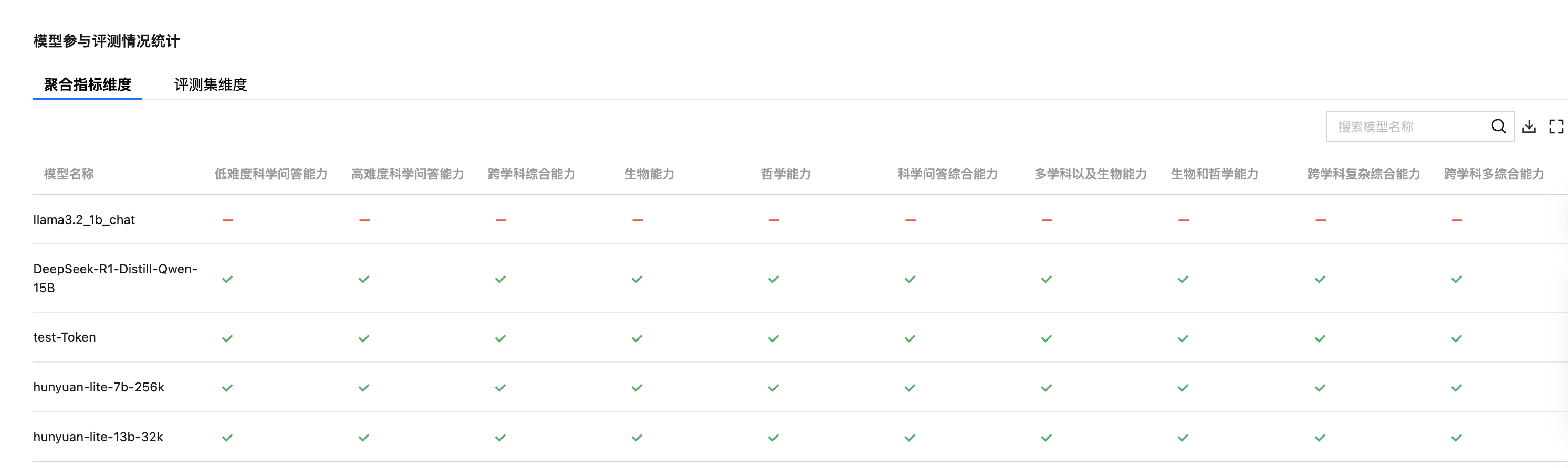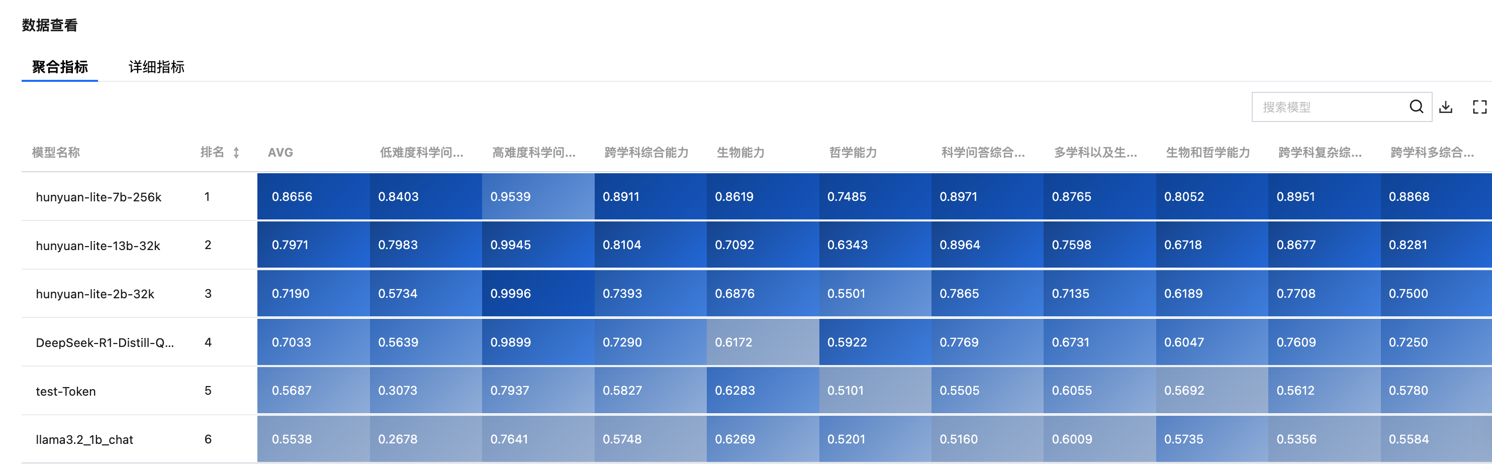 右上角的搜索框可帮助用户快速筛选模型,查看聚合指标结果