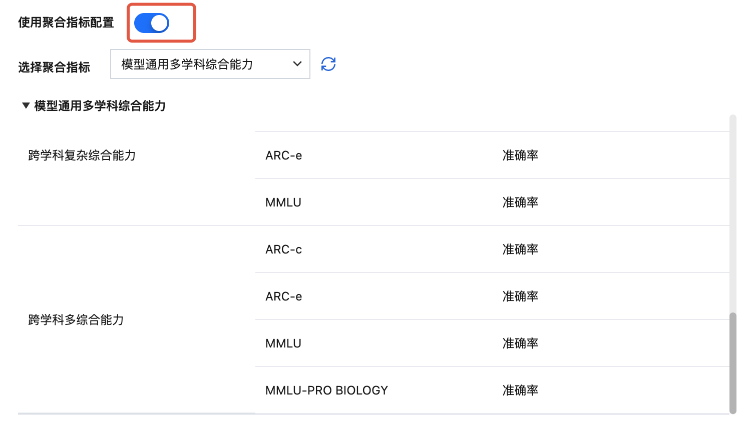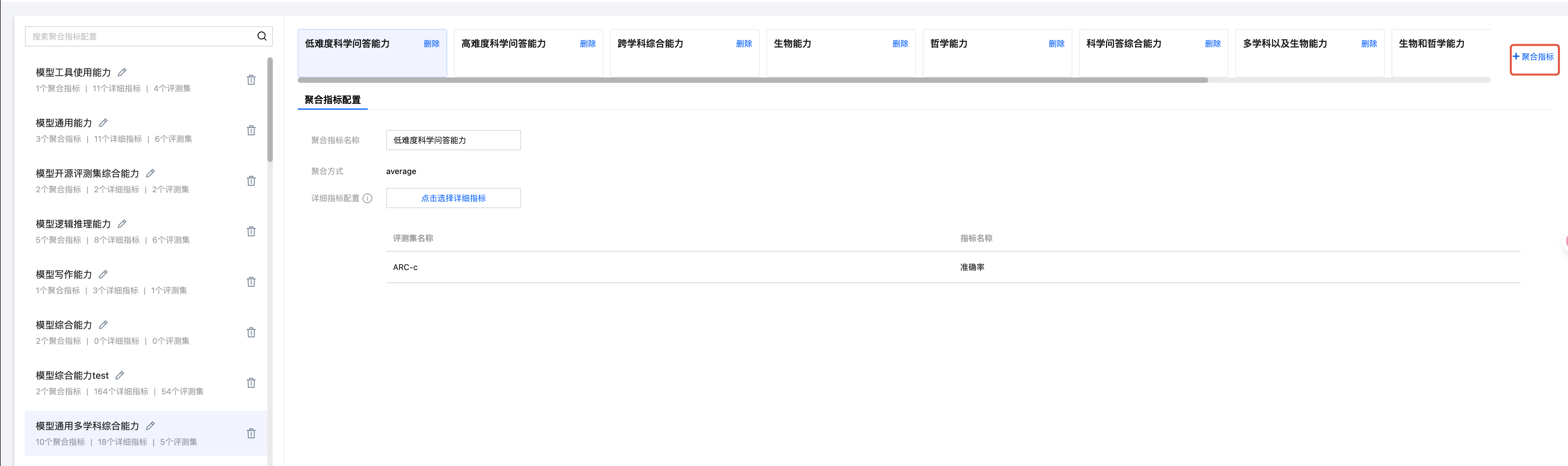 比如判断模型在多学科的综合通用能力,可以设置低难度、高难度、跨学科、生物、哲学等多个不同维度的聚合指标,后续在对比评测时可以通过直接选择此配置得出在聚合指标上的对比结果。