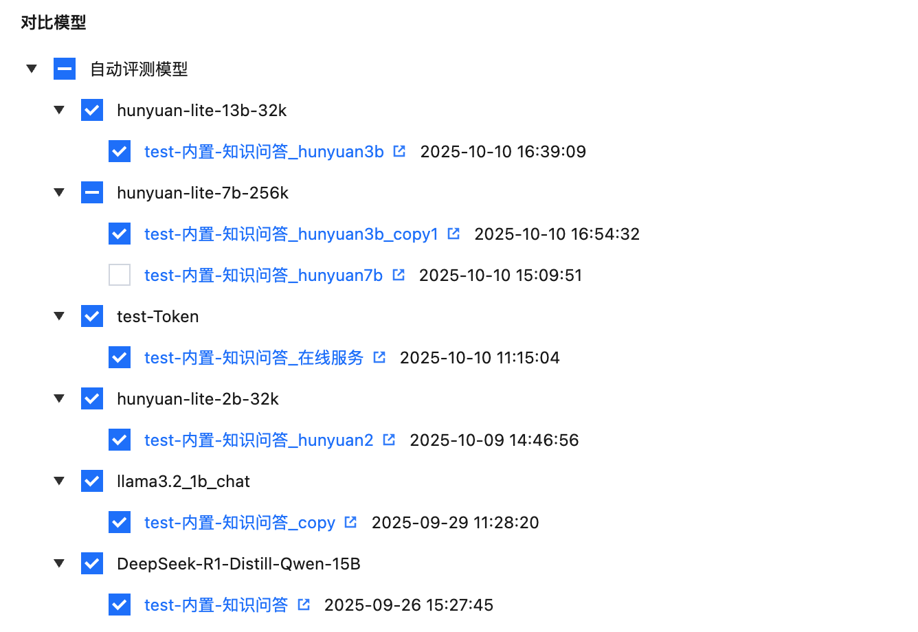 1. 选择评测任务,支持选择“已完成”的自动评测和“已完成打分”的人工评测,最多选择10个任务。 2. 选完评测任务,会自动出现选中评测任务使用的评测数据集和评测的模型,数据集和模型默认全选,也可勾选去除。此模型相关的评测任务会按最新评测时间进行罗列,用户可选择相关的评测任务。如下图: