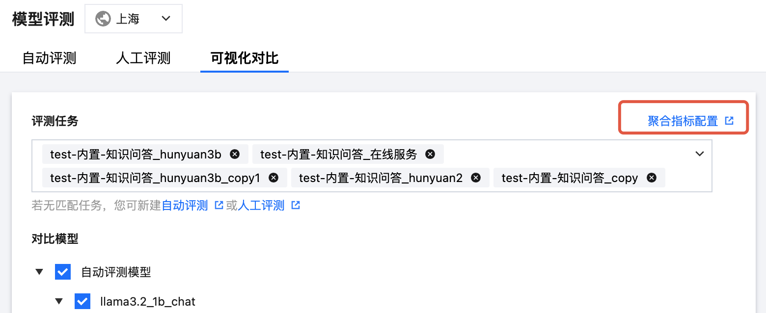 方式2 聚合指标对比:完成聚合指标配置后,选择自动评测任务,对不同模型在相同的聚合指标进行横向对比。