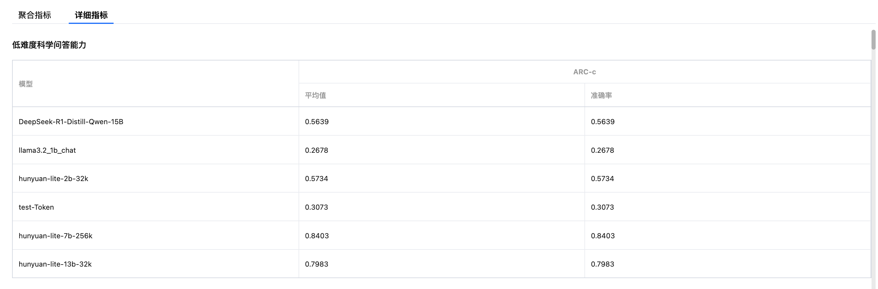 单击“详细指标”tab,可查看每个模型在评测集上的详细指标值。