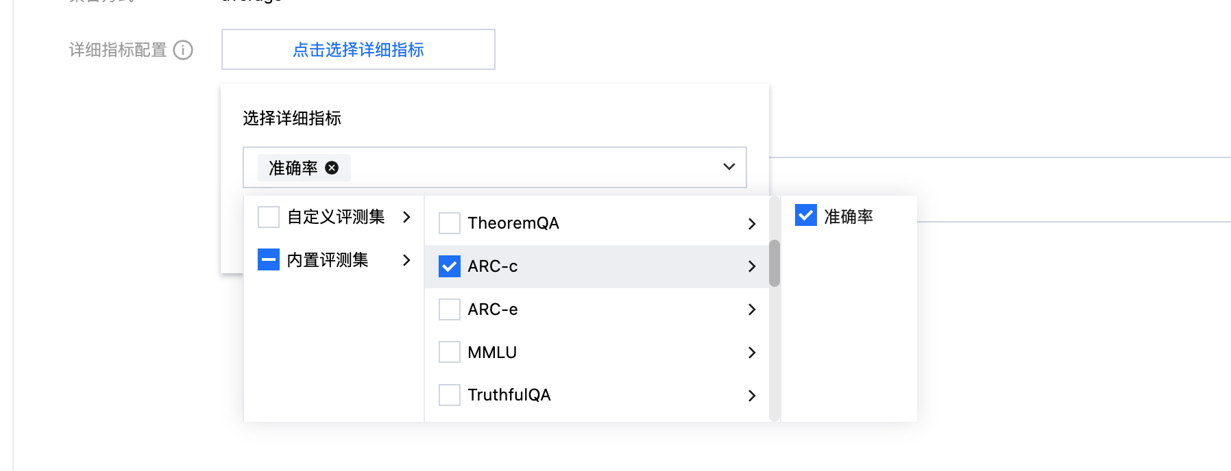 3、单击“选择详细指标”按钮,在对应的聚合指标上,选择对应的评测集以及指标。