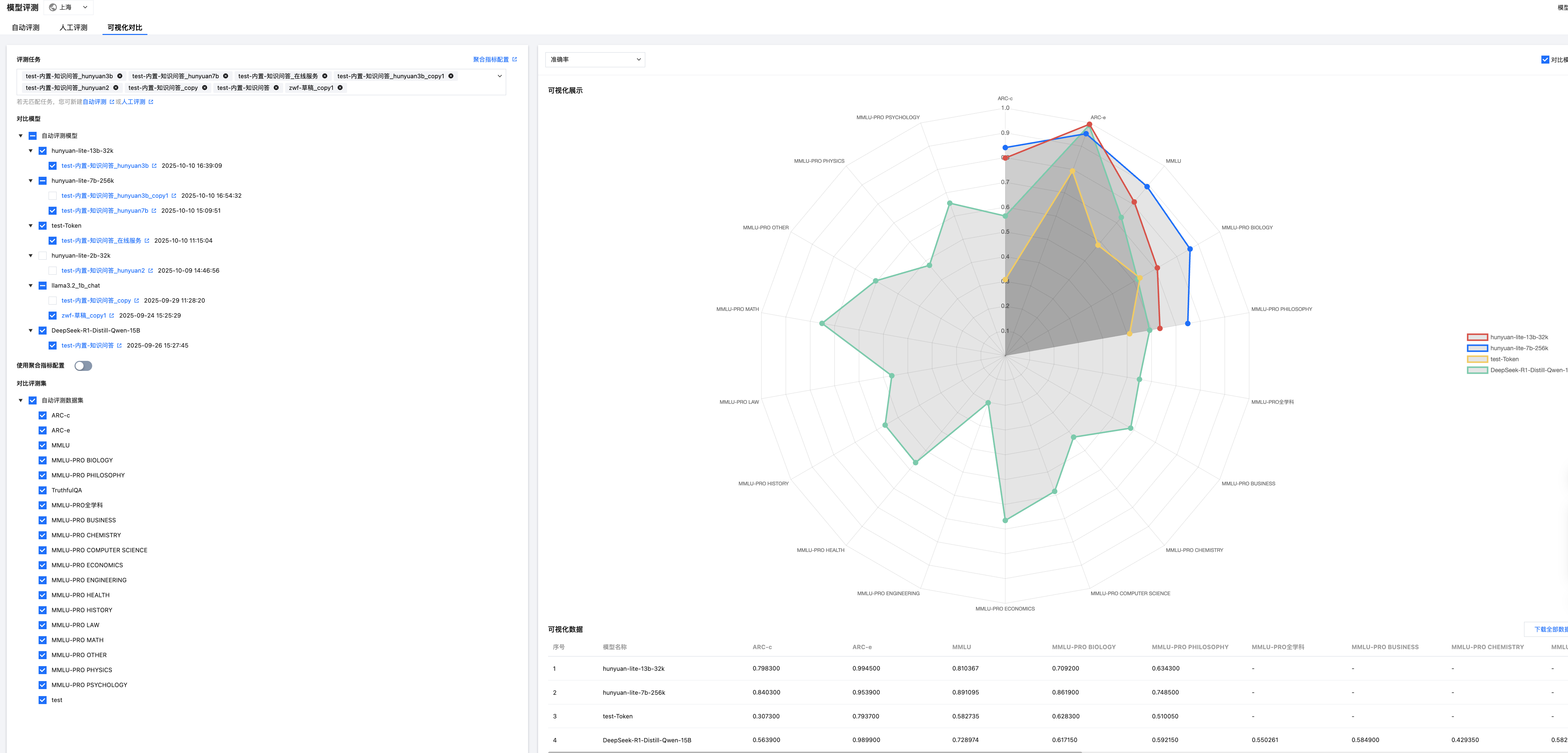 3. 单击应用,右边即可出现选中评测任务,基于选择的模型和数据集的雷达图对比展示,如下图:
