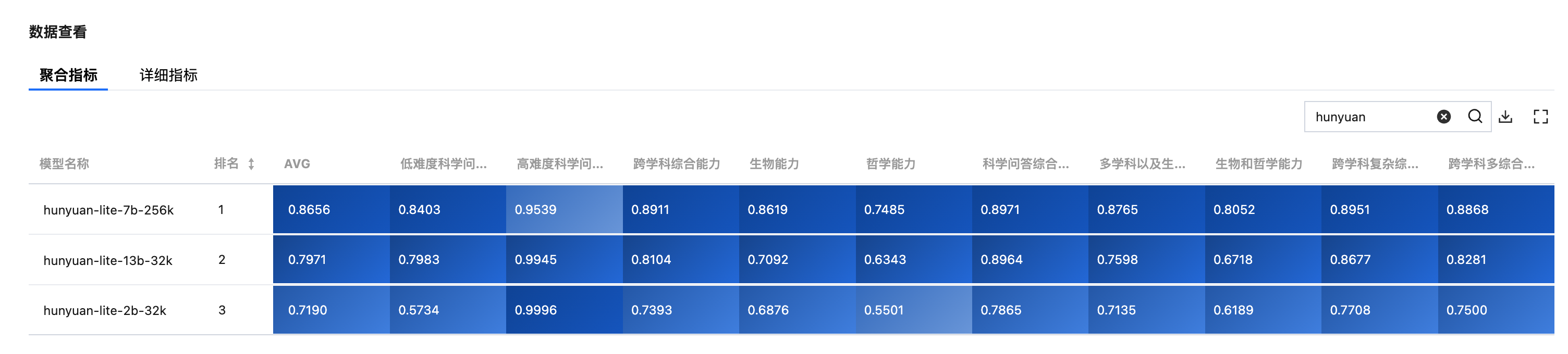 同时,各模型在聚合指标上的能力将进行排名,也可在表格中看到各聚合指标的详细数据以及在各个评测集上每个指标的详细数据。表格中通过颜色深浅帮助用户方便直观查看在每个聚合指标上的最优和其他指标值。