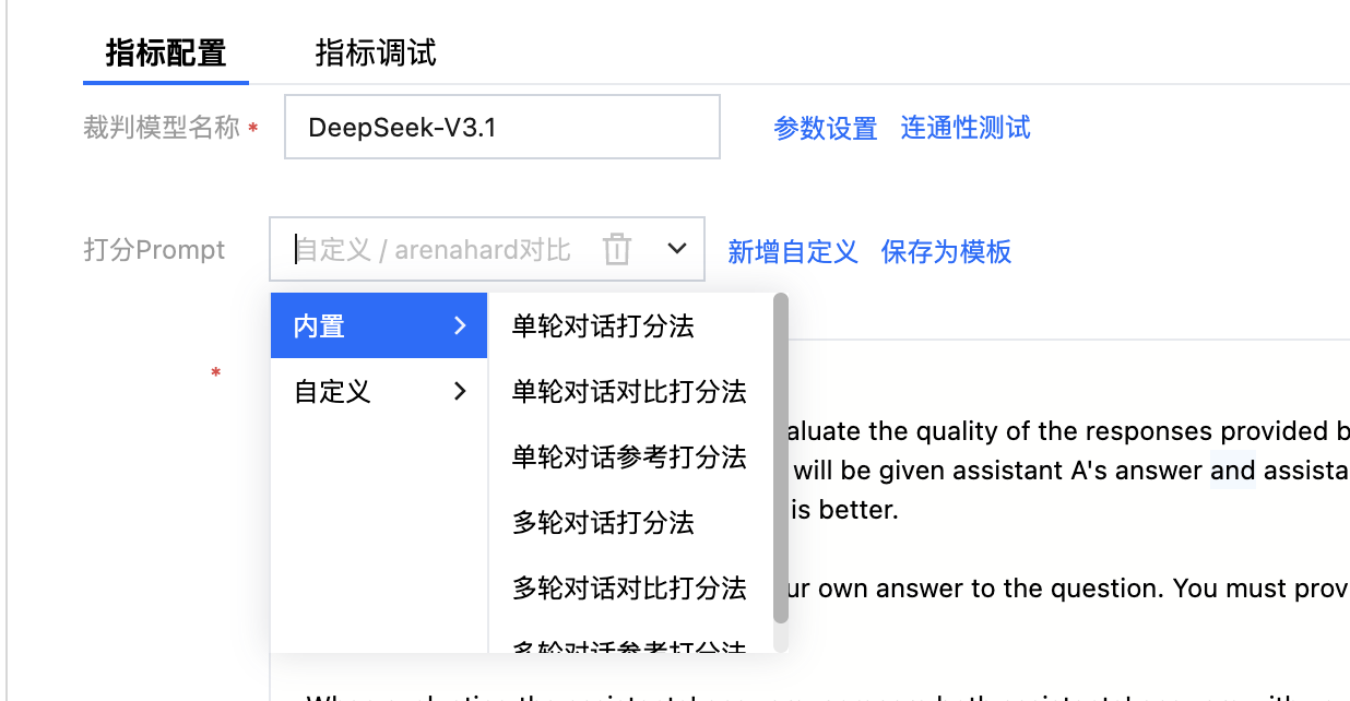 judge_template_content | 是 | 裁判模型打分模板 | """裁判员的打分模板,例如: 你是一个裁判员,请对回答进行打分。[历史信息和问题] {% for message in data.messages %} {{'<|im_start|>' + message['role'] + '\\n' + message['content'] + '<|im_end|>' + '\\n'}} {% endfor %} [待评测模型的回答] {{ response.content }} [参考答案] {{ data.ref_answer }} 请给出你的打分,最高分{{ max_score }},最低分{{ min_score }}。 """ |