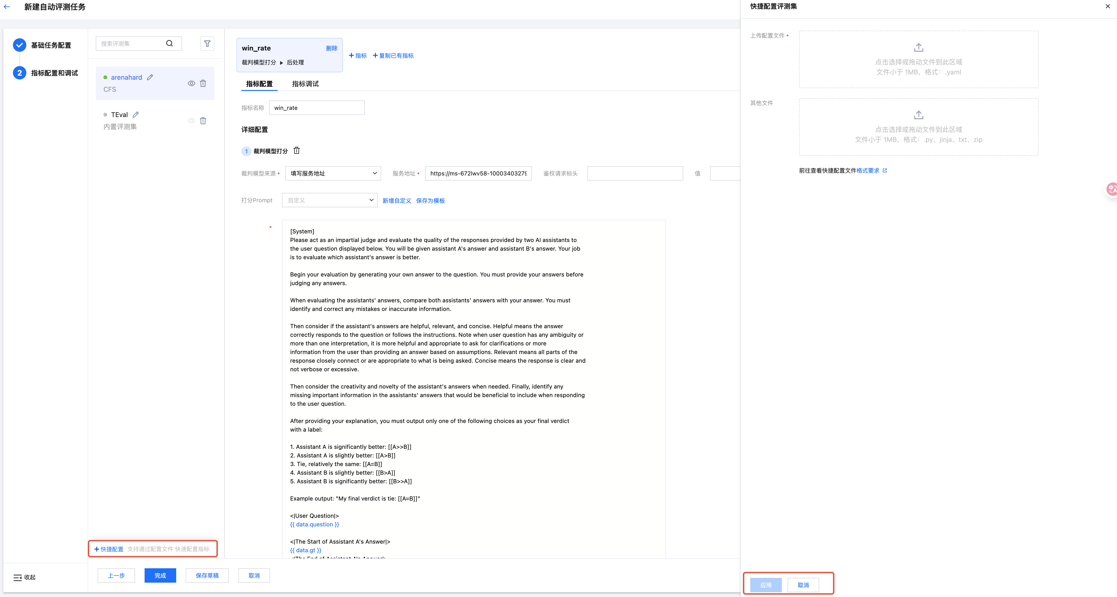 - data_name: your_dataset_name # 数据集名称,依本字段和在评测集配置页面所填写的名称进行关联metrics: # 接下来配置的是该数据集所包含的一个或多个指标# name 指标名- name: 裁判模型打分# pipeline 字段用于定义打分过程,本数组每个成员依次对应一个处理节点pipeline:# type 为 PREPROCESS 代表本节点是前处理节点- type: PREPROCESS# filename 用于指定前处理/后处理依赖的 Python 脚本名# 本字段填写相应文件相对于压缩包内根目录的相对路径filename: scripts/preprocessor.py# file_content 前处理/后处理步骤也可以直接将脚本内容填入本字段file_content: |-def preprocess(data, resp, **kwargs) -> bool | int | str | float | None:pass# type 为 JUDGE_MODEL 代表本节点是裁判模型打分节点- type: JUDGE_MODEL# 通过配置 judge_model 字段来配置裁判模型的信息judge_model:name: DeepSeek-R1 # 裁判模型名称# 裁判模型调用方式:# 填写 MS 代表使用 TI 平台在线服务# 填写 URL 代表使用第三方URLsource: MS# ti_model_service_api 如果使用 TI 平台在线服务则需要填写本字段ti_model_service_api:# service_group_id 在线服务ID,例如 ms-45mrs4rvservice_group_id: ms-xxxx# service_group_name 在线服务名称service_group_name: "DeepSeek-R1裁判模型"# service_id 在线服务ID,对应在线服务详情-服务管理中的某个版本的ID,例如 ms-45mrs4rv-1# 如果不填,则默认填写为 service_group_id 加后缀 -1service_id: ms-xxxx-1# url_prefix 在线服务详情-“服务调用”页面所展示的“常规服务调用”地址url_prefix: http://ms-xxxx-uuuu-sw.gw.ap-region.ti.tencentcs.com/ms-xxxx# path_suffix 在线服务暴露的调用对话接口的 pathpath_suffix: /v1/chat/completions# auth_token 鉴权 Token,可通过在线服务详情-“服务鉴权”页面查看auth_token: "aaaaaaaa"# third_party_api 如果填写URL进行调用,请填写本字段third_party_api:# url 调用 URLurl: http://ms-xxxx-uuuu-sw.gw.ap-region.ti.tencentcs.com/ms-xxxx/v1/chat/completions# authorization_header 鉴权HTTP Headerauthorization_header:# key HTTP Header Keykey: authorization# value HTTP Header 内容value: your_token# generation_params 调用裁判模型的参数# 请特别注意:因为腾讯云API规范的限制,本字段是一个字符串# 即,请在本字段后添加 `|-` 以限制字段类型为字符串# 我们会在后续解析时,将本字段转换为裁判模型请求体中的参数generation_params: |-temperature: 0.8top_p: 0.85# judge_template_filename 裁判模型打分模板文件judge_template_filename: template.jinja# judge_template_content 如果不指定文件,也可以通过本字段指定裁判模型打分模板内容judge_template_content: |-你是一个裁判员,请对回答进行打分。最高分为 5 分,最低分为 1 分。[问题]{{ data.question }}[待评测模型的回答]{{ response.content }}[参考答案]{{ data.ref_answer }}现在请给出你的打分。# type 为 POSTPROCESS 代表本节点是后处理节点- type: POSTPROCESSfilename: scripts/postprocessor.py- data_name: another_dataset_name # 用户可以在一个YAML配置文件中对多个数据集进行配置metrics:- name: 裁判模型打分pipeline:- type: PREPROCESSfilename: preprocessor-at-root.py- type: JUDGE_MODELfilename: judge.yaml # 裁判模型也可以单独通过 YAML 文件配置- type: POSTPROCESSfilename: postprocessor-at-root.py