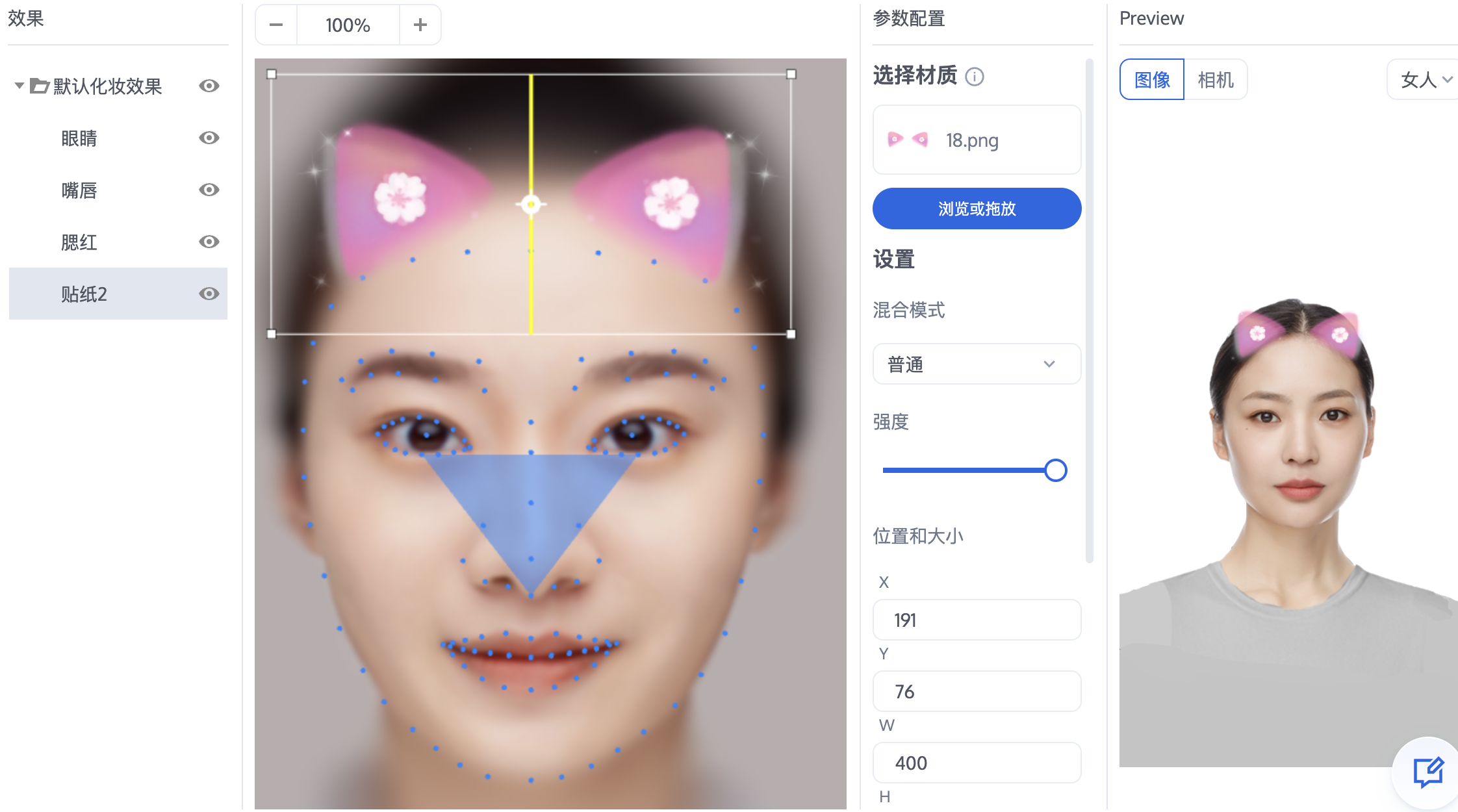 (x, y)是以贴纸左上角为基准的相对位置系数,x为相对贴纸宽度的系数,y为相对贴纸高度的系数,例如默认的锚点位置参数(贴纸中心点)为(0.5, 0.5),若期望以贴纸左上角顶点为锚点,则设置锚点位置为(0, 0)。合适的锚点位置可以实现更好的贴纸跟踪效果,例如头饰类贴纸锚点适合落在前额位置,脸部贴纸如眼镜锚点适合落在鼻子中庭位置,具体可以多尝试下,找到最合适的位置。