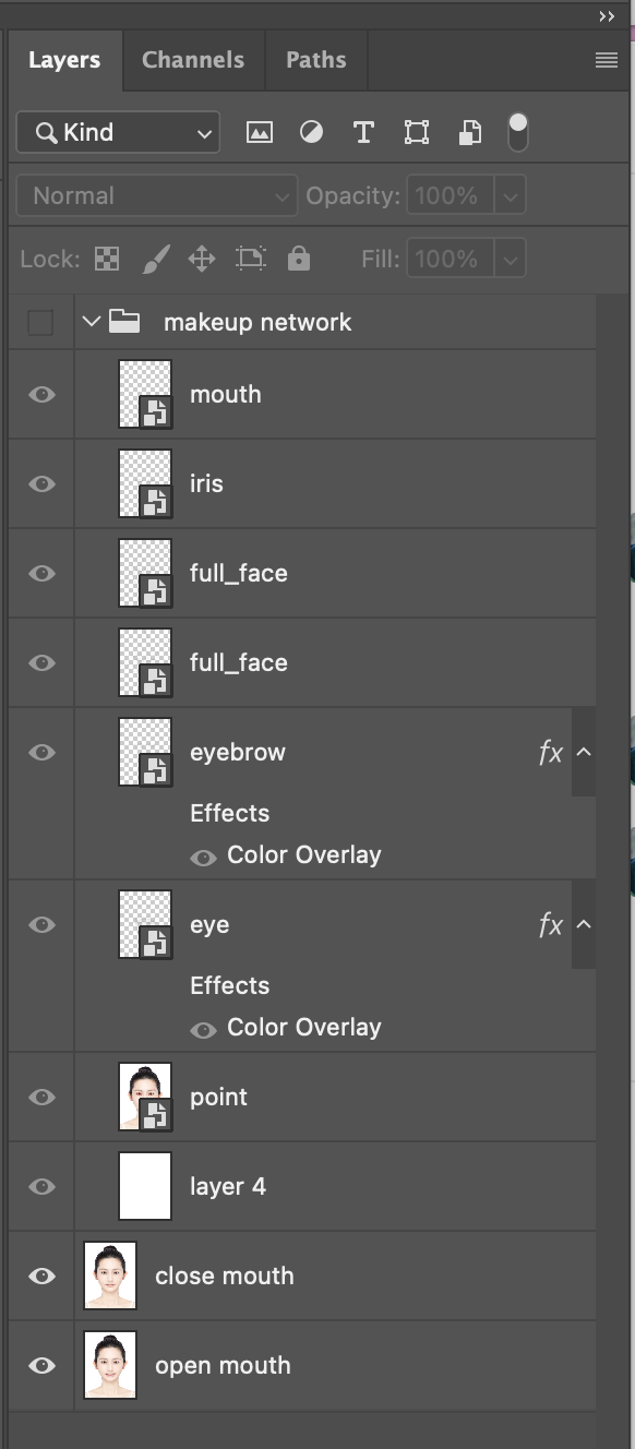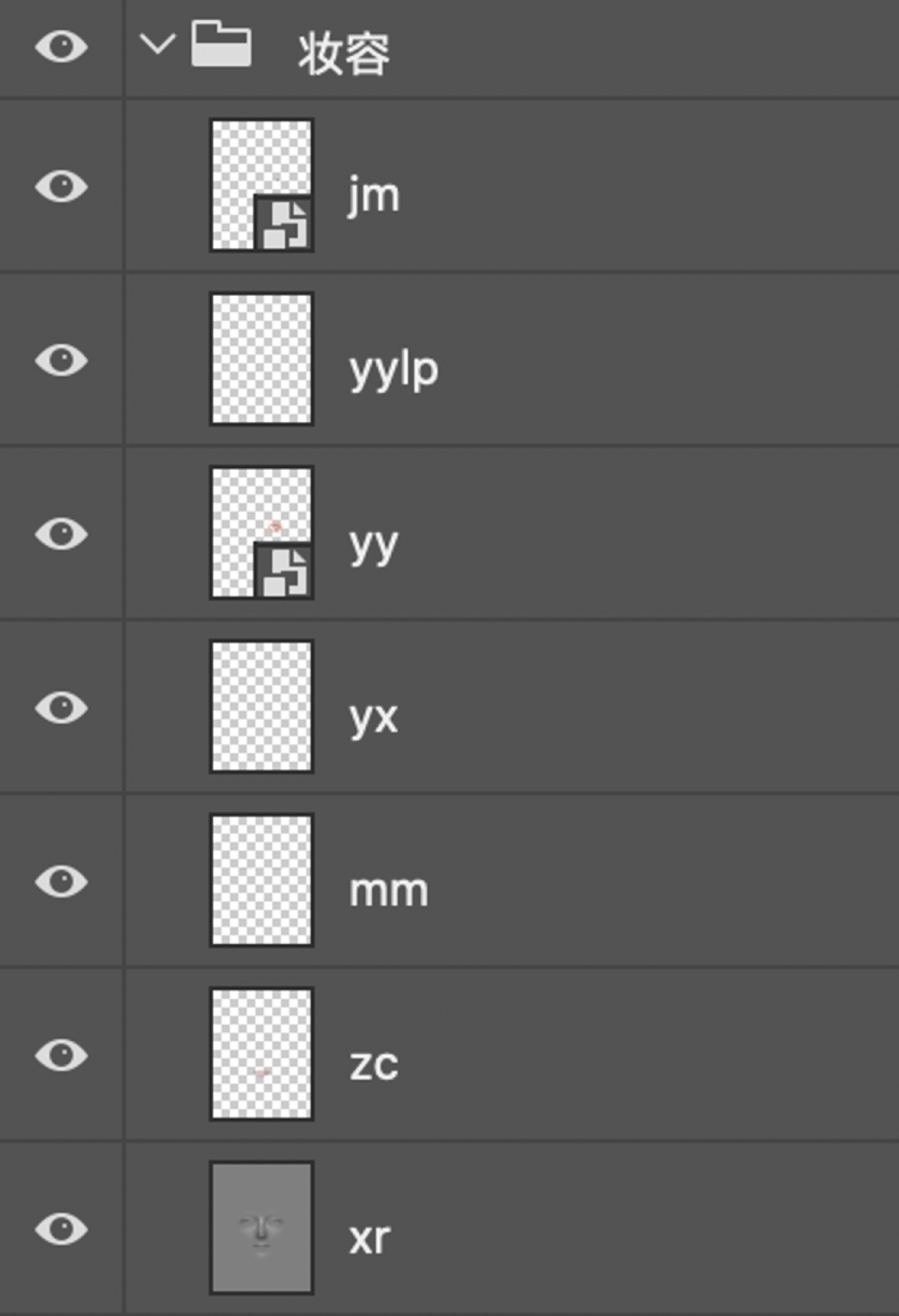 导出后妆容包内文件构成可参考示例结构图。导出妆容图层(如眼、眉、唇、全脸妆容)的图片尺寸为 768 × 1024。美瞳素材请遵循“美瞳素材制作”章节的要求,单独导出为 125 × 125 尺寸。 4. 图层混合模式建议