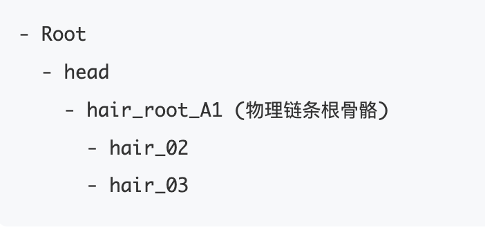 需要物理运算的骨骼,是指物理链条的起始骨骼(作为 Root 的子级),根骨骼命名可以用数字,ABC+数字来命名。方便物理配置。