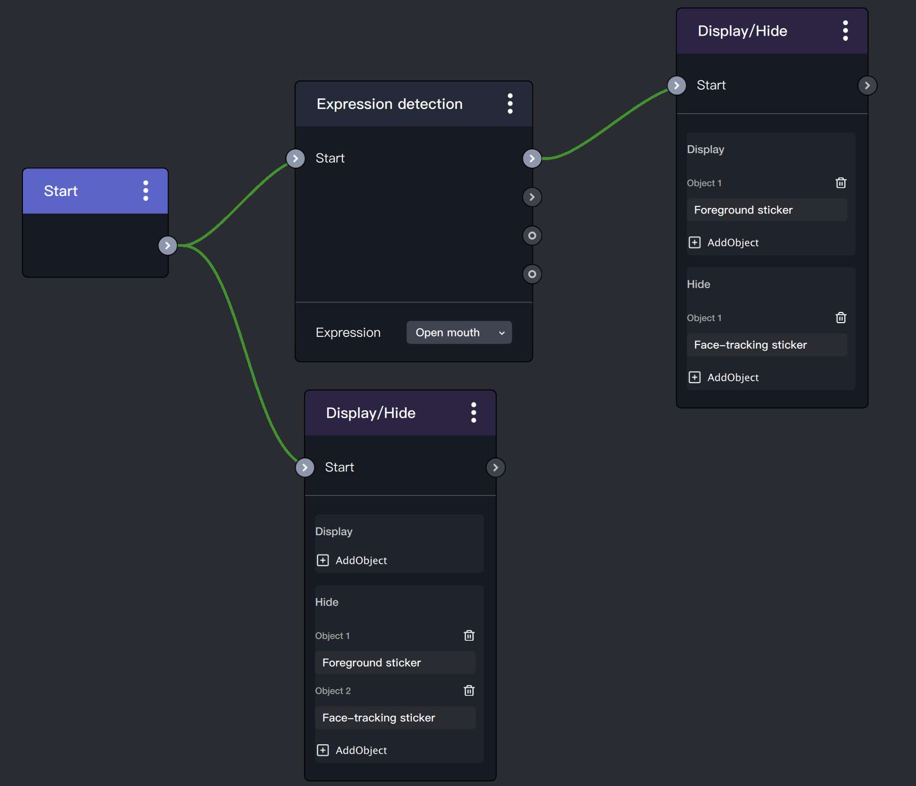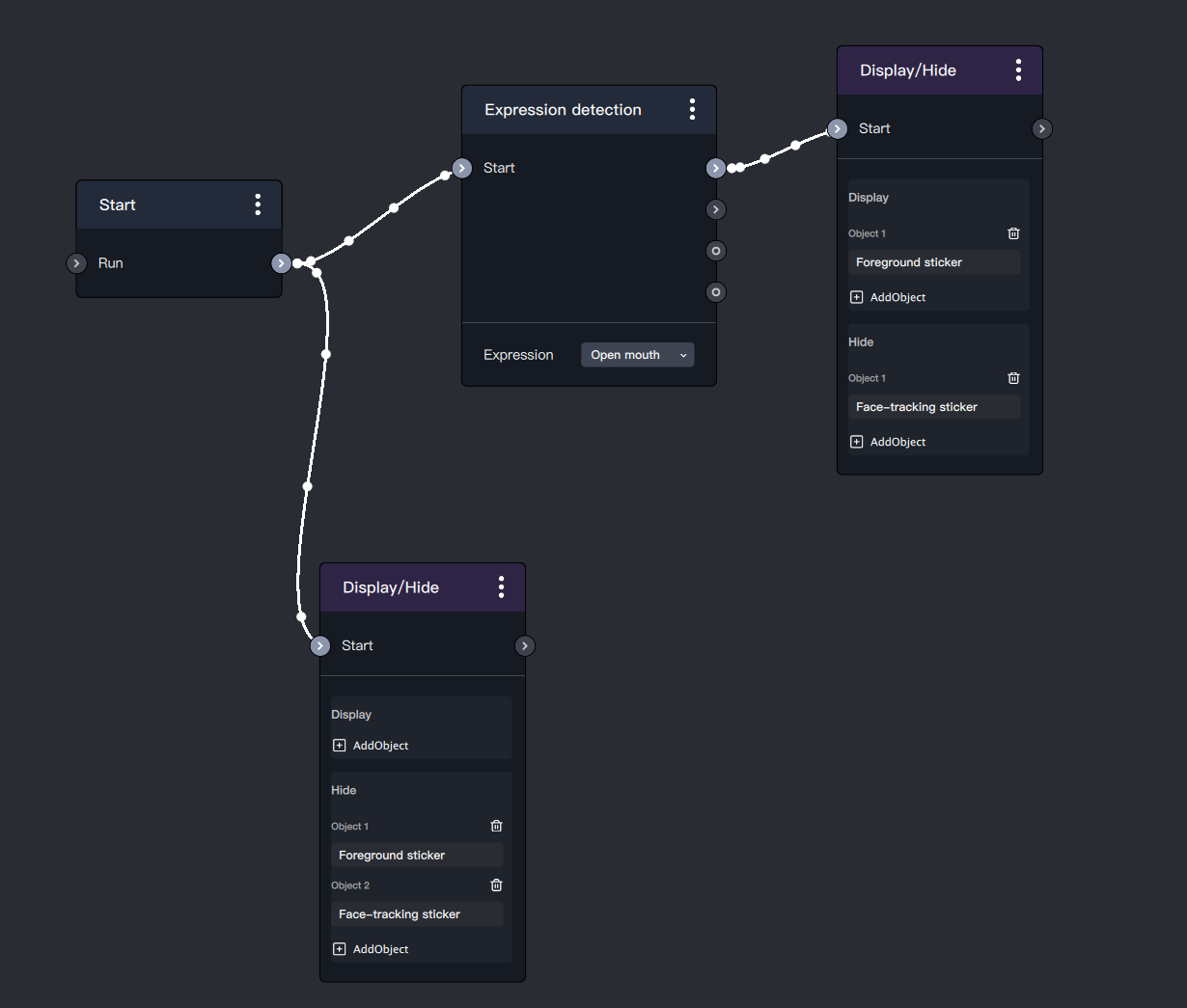 1. 按上述脸部表情触发教程的第1-11步,创建工程,导入两个图片文件。添加一个前景贴纸和一个人脸跟随贴纸,添加两个“出现/消失”的 node 以及一个“表情检测”的 node,最后将它们连接起来。如下图所示: