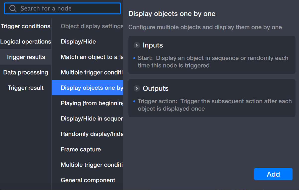 Tencent Effect 的流程管理中,包含了触发条件、逻辑判断、触发结果以及数值定义四大板块。每个板块中又包含了不同的触发,可以搭配使用,实现想要的播放效果。