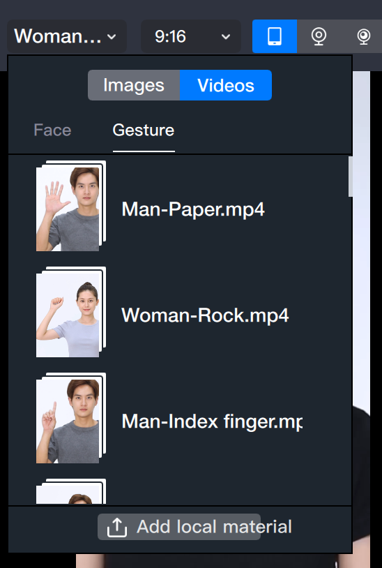 1. 在右上角的预览面板中,单击下拉框,选择"手势"选项,然后选取一个合适的手部动作。