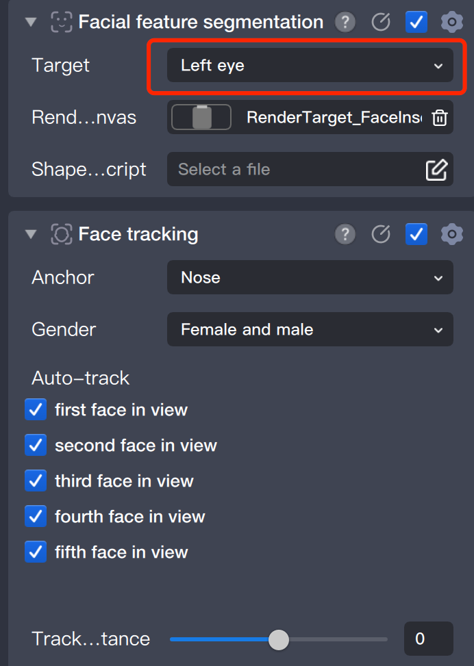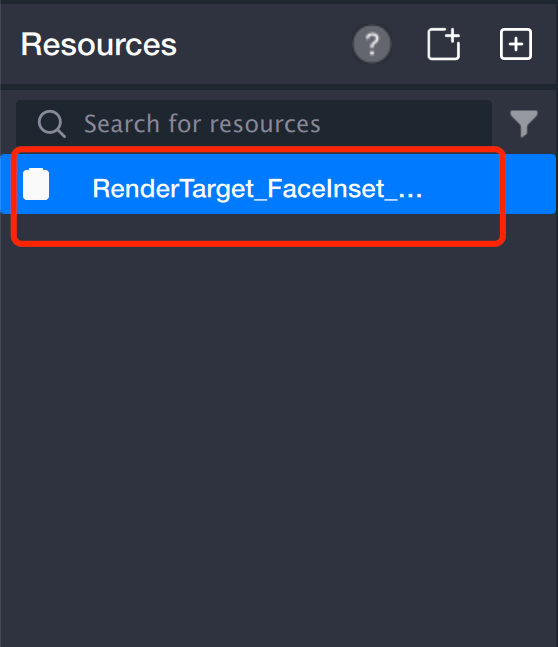 2. 添加选取五官能力后,资源面板会出现一个 RenderTarget_FaceInset1.rdt 文件,该文件是分割能力输出的结果,即抠出的五官会输出到该文件中(后续可作为贴纸使用)。