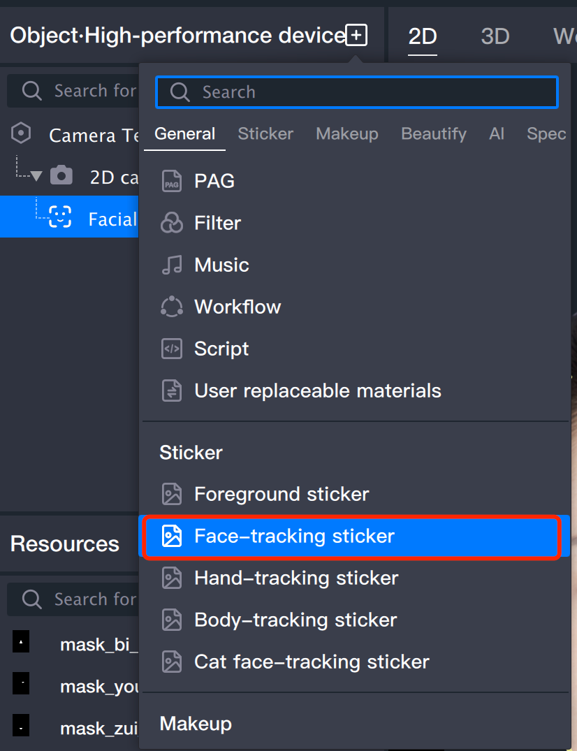 1. 在对象面板中添加人脸跟随贴纸(也可以添加前景贴纸/手势跟随贴纸/身体跟随贴纸/猫脸跟随贴纸)。