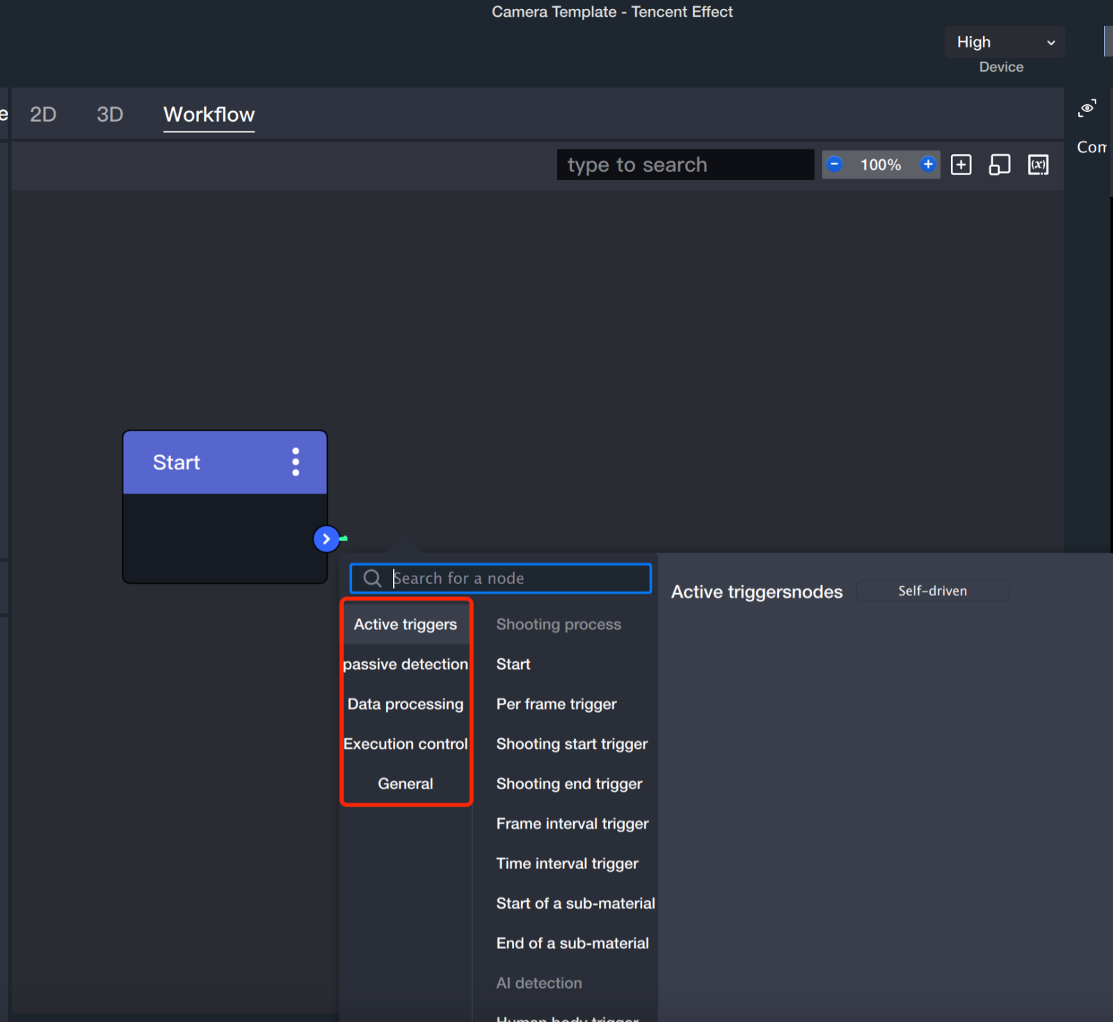 在短视频创作中,除了平铺直叙的效果展示以外,往往还会有一些剧情或触发逻辑。这时就需要使用流程面板,它的主要作用是让用户能够有序、有规则地组织自己的设计效果,使玩法呈现为一个完整的剧情脚本。