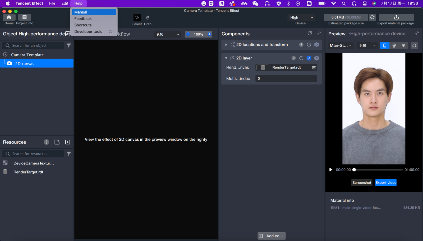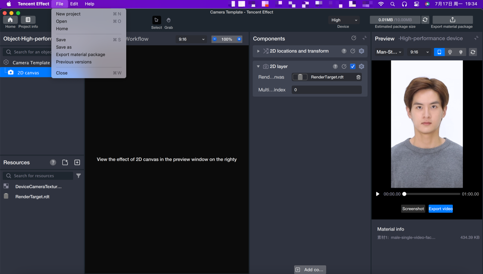 Tencent Effect 的工作区是由一组模块化面板组成,面板是 Tencent Effect 制作编辑作品的主要工作区,所有面板都可以缩放,预览面板还支持隐藏和展开。