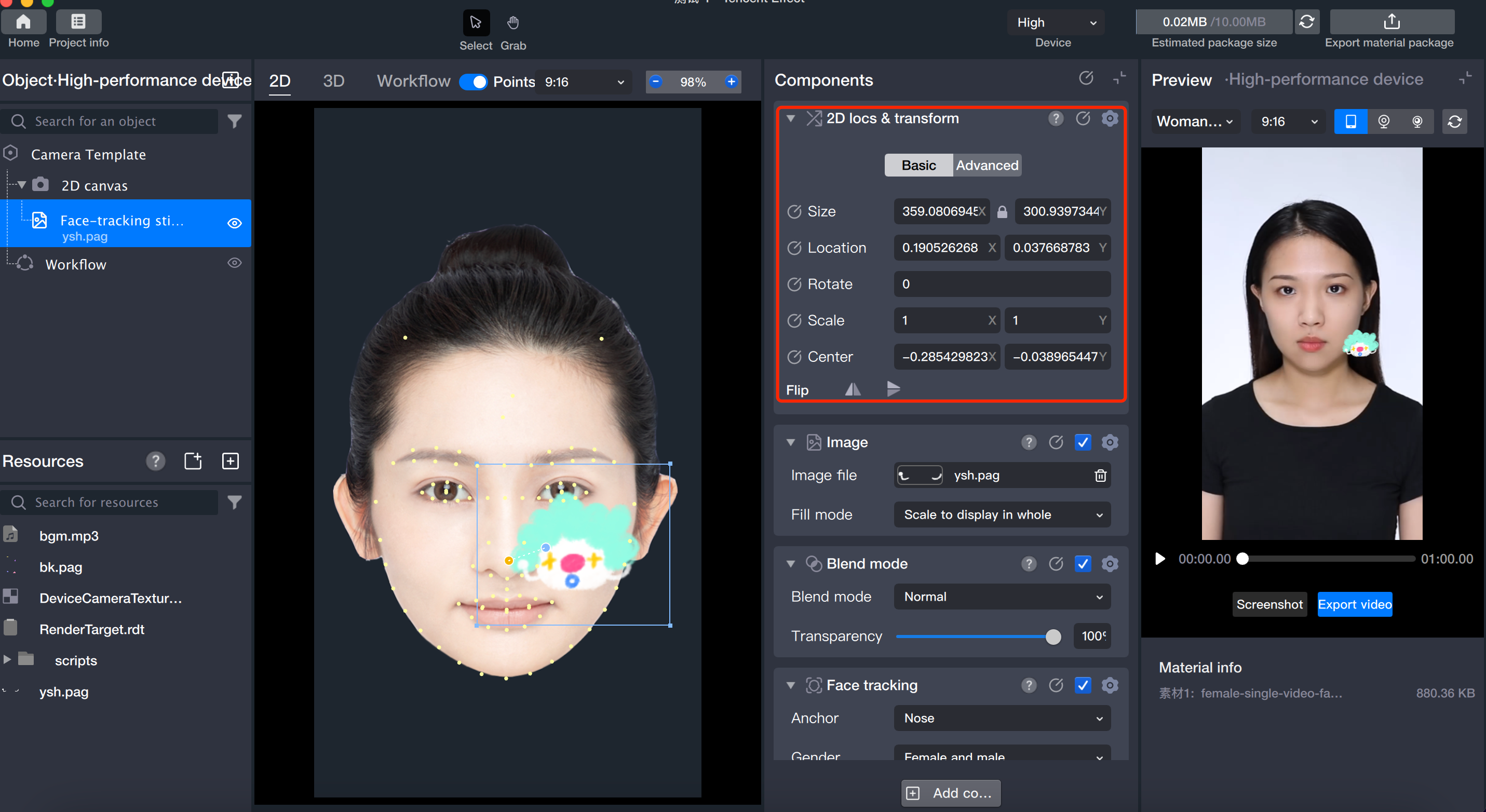 跟随组件中,可以添加 2D 图片、pag 等文件到出现在屏幕中的特定物体上。目前,Tencent Effect 支持人脸、手势、身体、猫脸跟踪。下文以介绍人脸跟踪玩法为例,其他跟踪玩法与此类似。