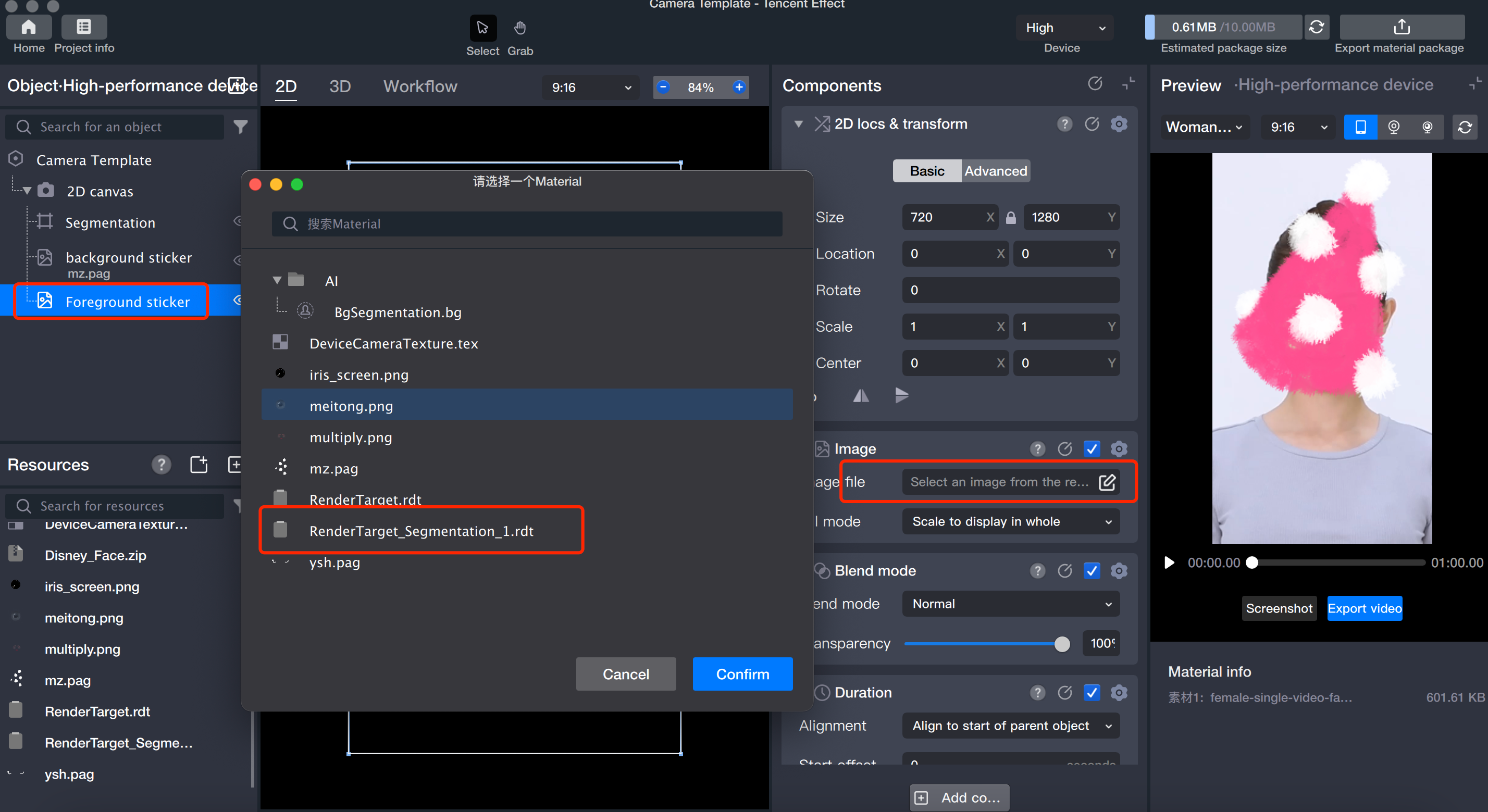 2. 选择贴纸文件:选中前景贴纸,点击图片文件,选择 RenderTarget_Segmentation_1.rdt 文件。